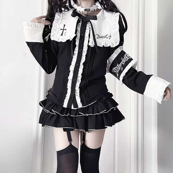 ブラックホワイトスクエアフリルカラーロングスリーブゴシックシャツ(lli_6714)