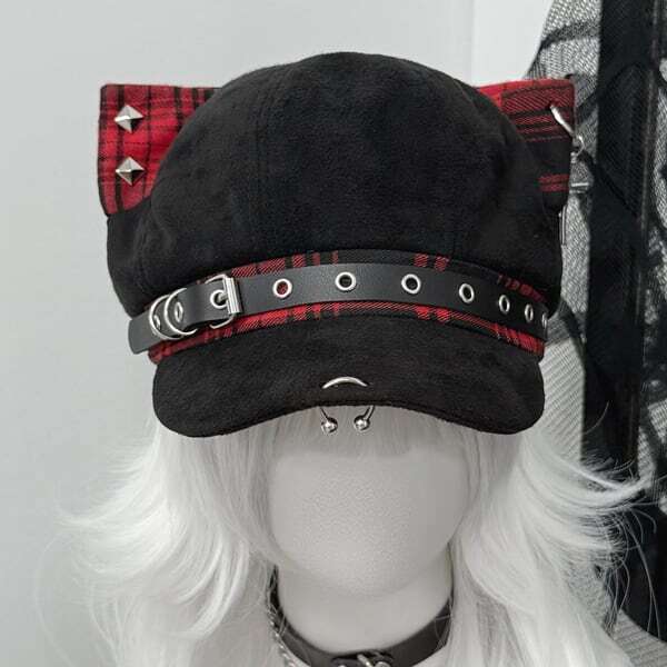 猫耳チェック切り替えスタッズパンクキャップ(3タイプあり)(lli_6769)