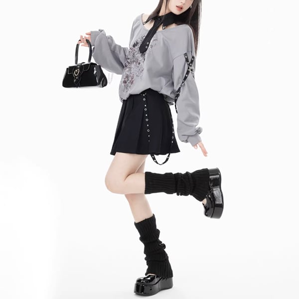 ブラックレギュラーカラーネクタイチェーンハトメスリーブプルオーバー(lli_5561)