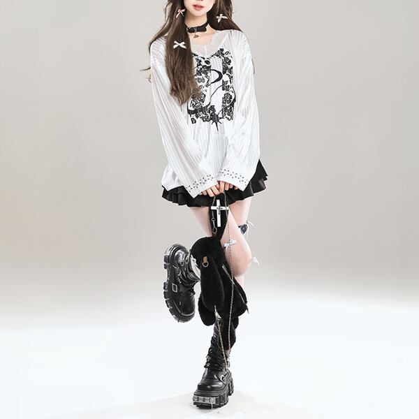 Vネックレースエッジカラーストライプパターンロングスリーブカットソー(2カラーあり)(lli_5572)