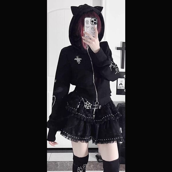 デコレーションスリーブ猫耳フーディジップアップショートブラックパーカー(lli_5685)
