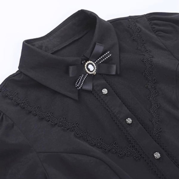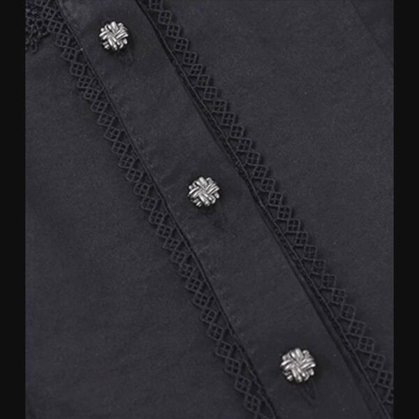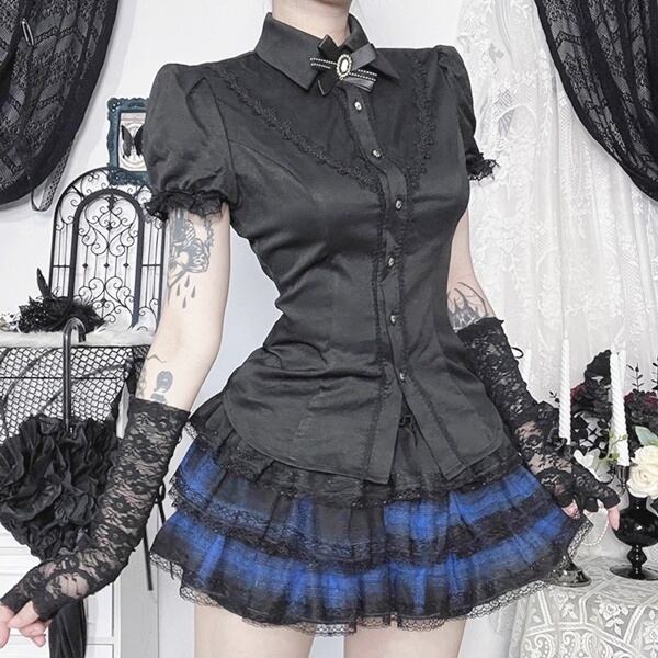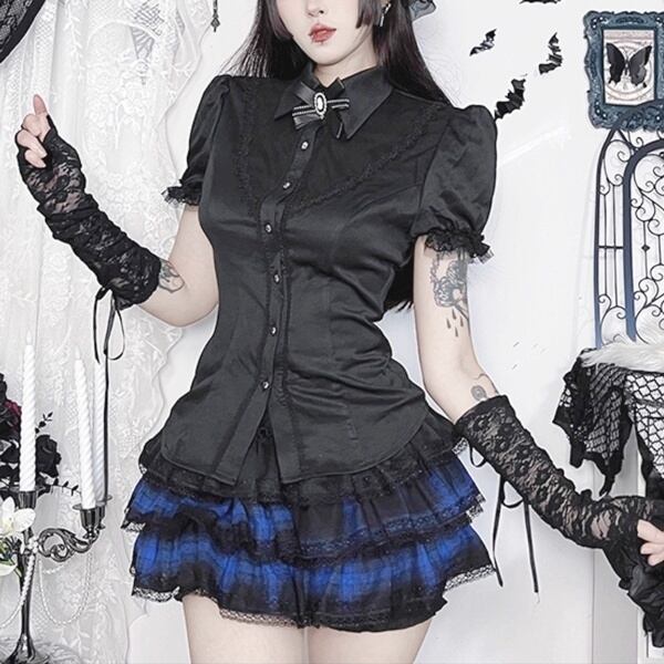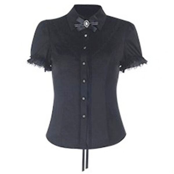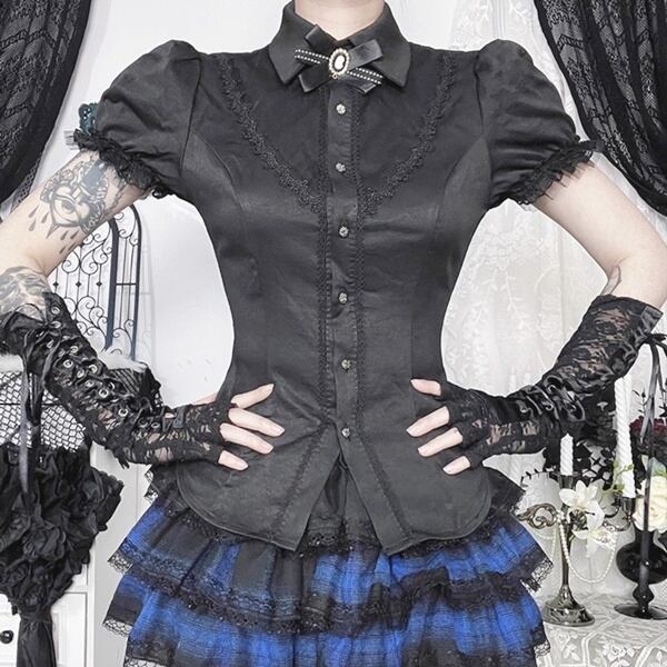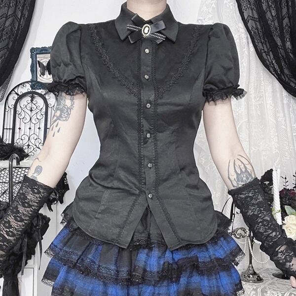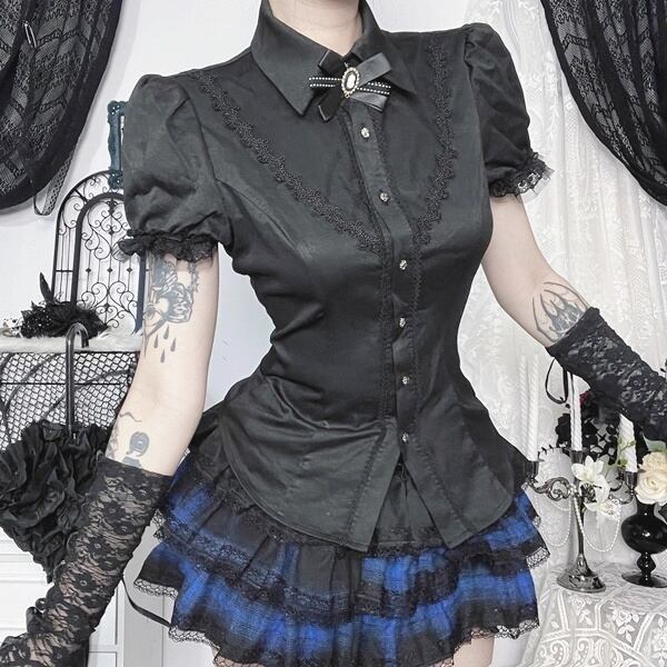 リボーンブローチフリルレースエッジショートスリーブブラックシャツ(lli_6015)