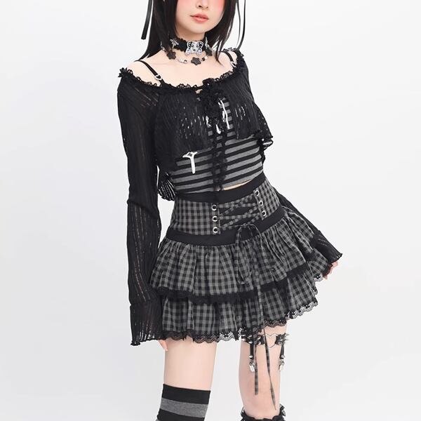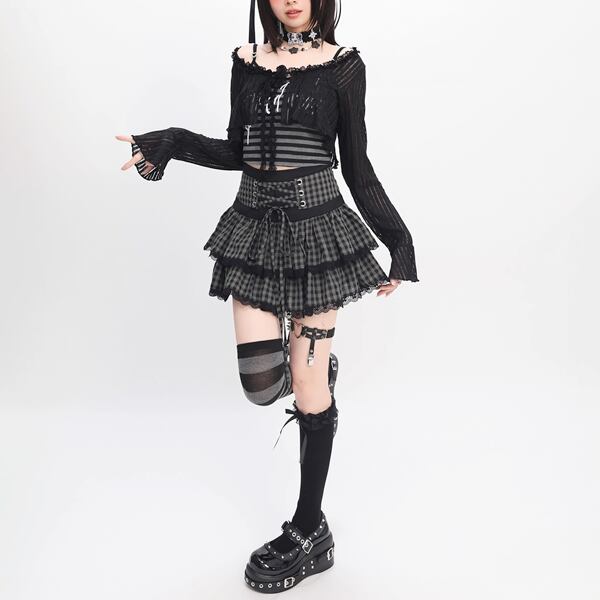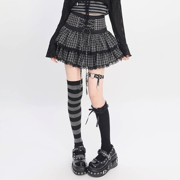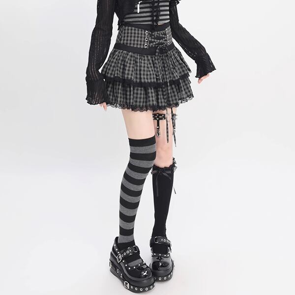 ウエストレースアップティアードブラックグレーチェックスカート(lli_6024)