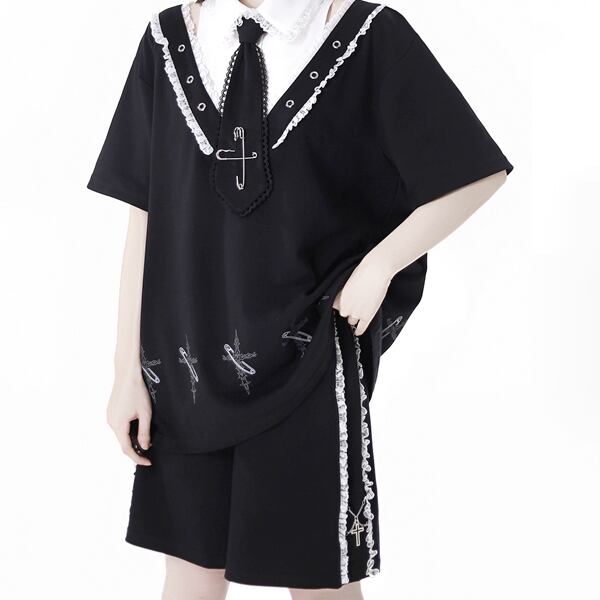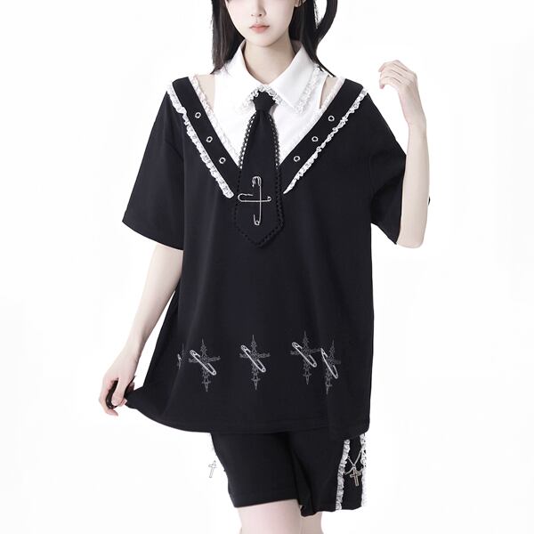 フェイクレイヤード安ピンクロスグラフィックネクタイシャツレースエッジカットソー(lli_6040)