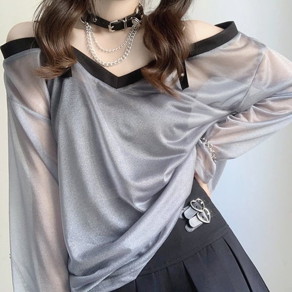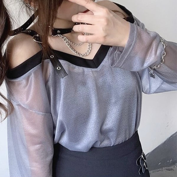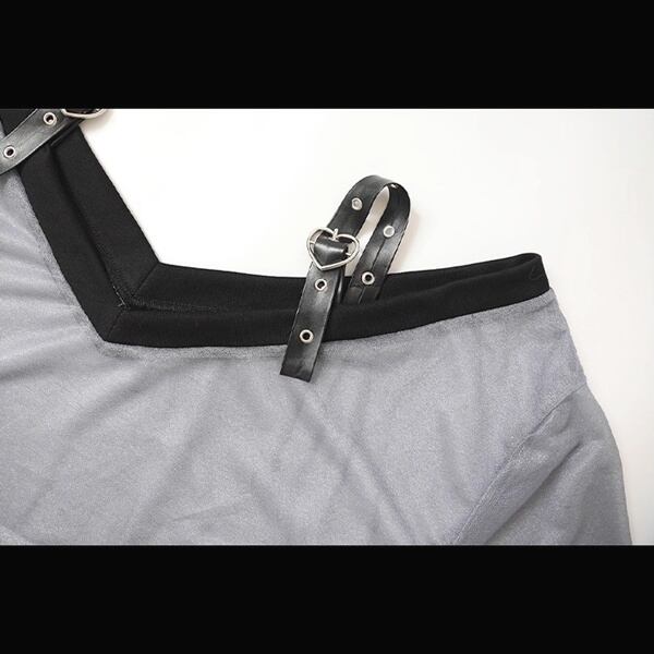 オフショルハートバックルダブルストラップシアーロングスリーブカットソー(lli_6047)