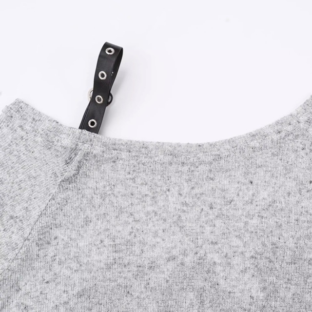 ワンオフショルストラップベルトハトメストラップグレーロングスリーブカットソー(lli_6085)