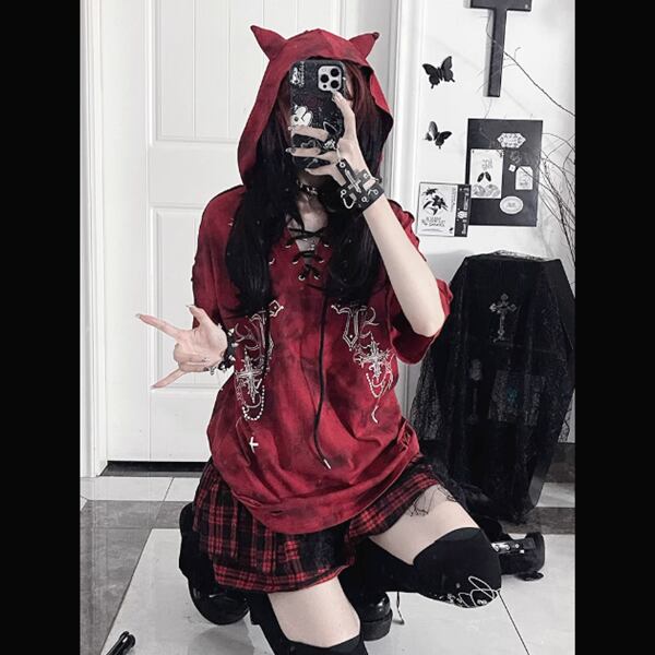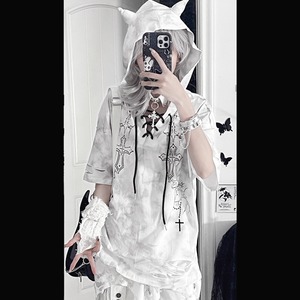 猫耳フーディフロントネックレースアップダメージロックカットソー(3カラーあり)(lli_6113)