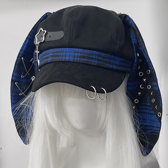 ブルーチェックパターンウサ耳パンクキャップ(lli_6162)