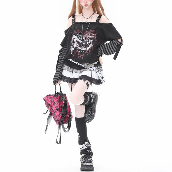 オフショルスリットボーダースリーブチェーンクロスボーンブラックカットソー(lli_6169)