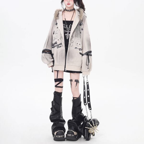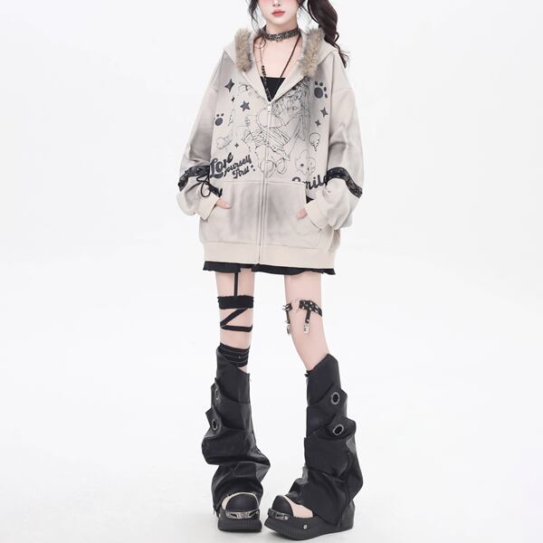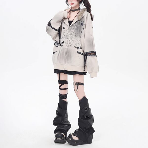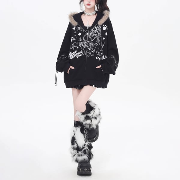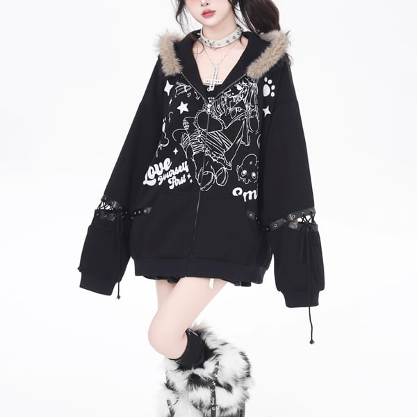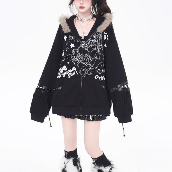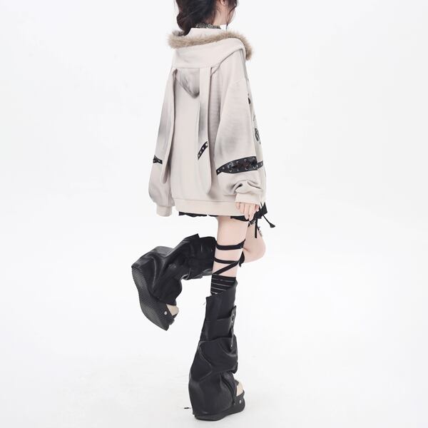 レースアップスリーブリボンジップアップウサ耳ファーフーディイラストジップアップパーカー(2カラーあり)(lli_6190)