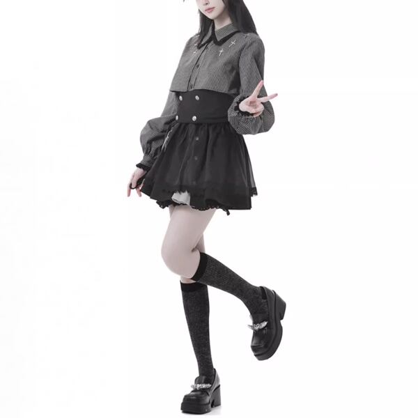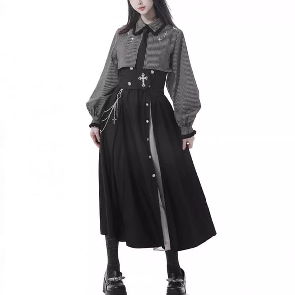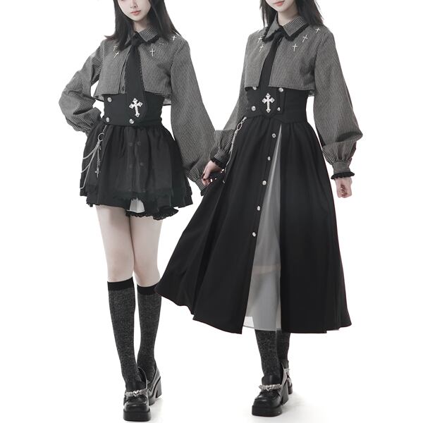 ネクタイ付ストライプクロスフリルカラーゴシックシャツ(lli_6199)
