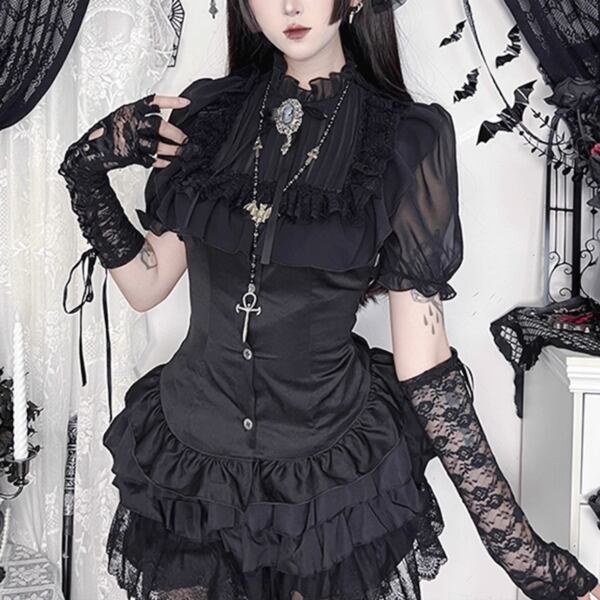 リボンブローチレースフリルエッジショートスリーブシャツ(lli_6209)