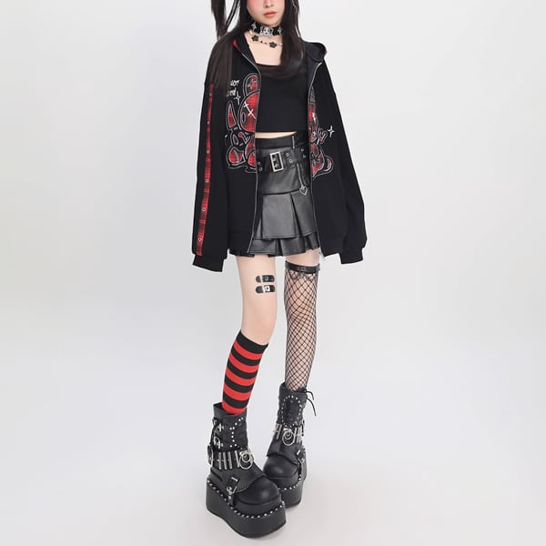 パッチワークレッドチェックラビットチェックラインスリーブジップアップパーカー(lli_6214)