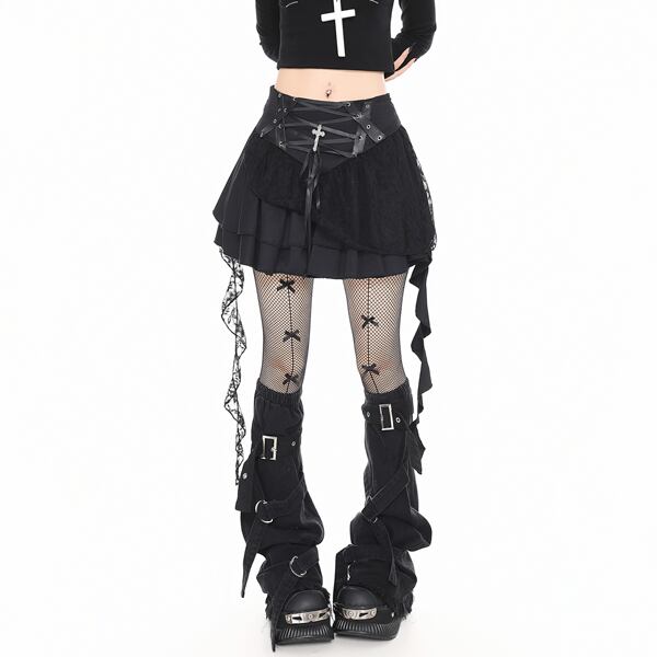 フロントウエストレースアップティアードプリーツスカート(lli_6225)