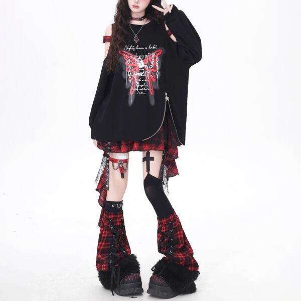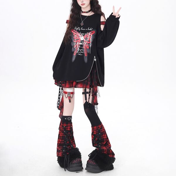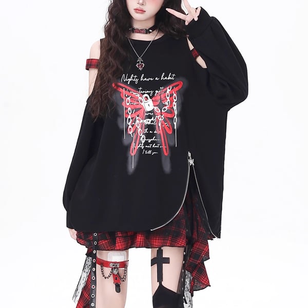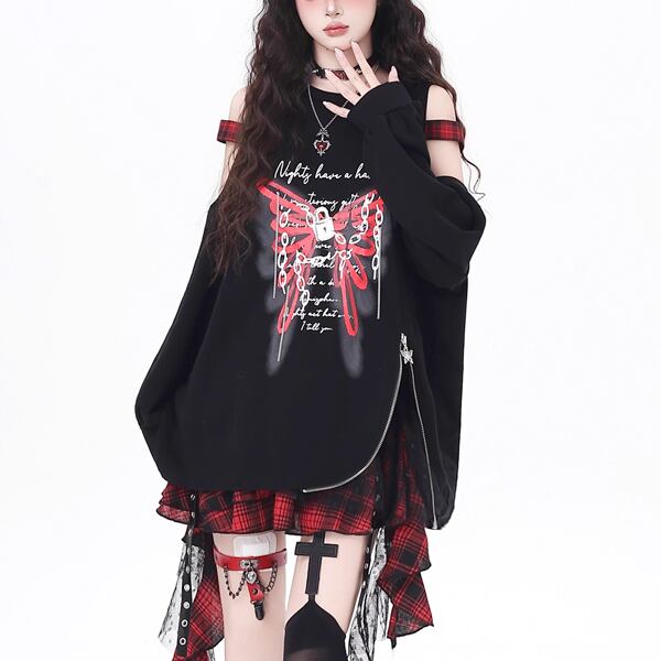 サイドスリットジッパーレッドチェックオフショルバタフライグラフィックプルオーバー(lli_6232)