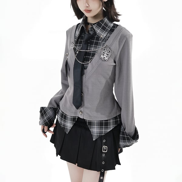 チェーンアクセフェイクレイヤードチェックカーディガンシャツ(lli_6245)