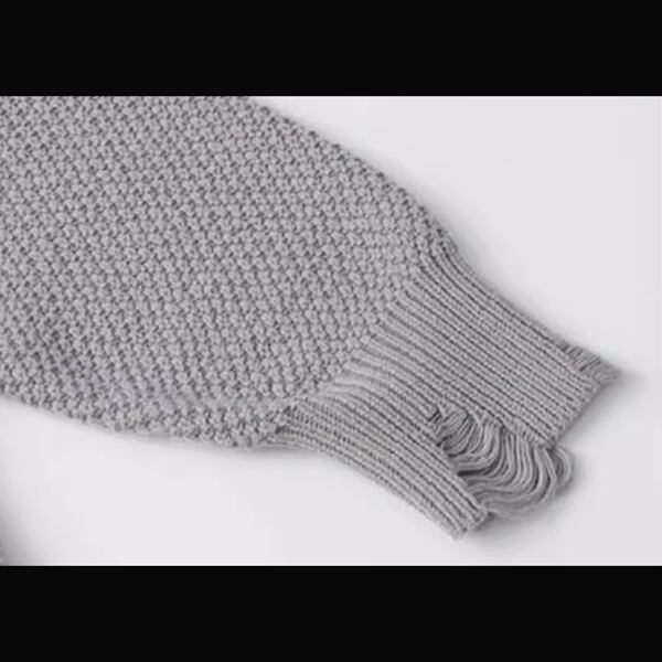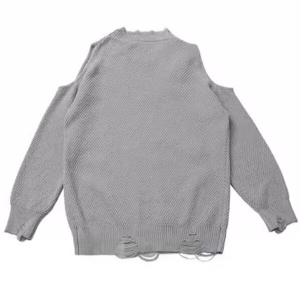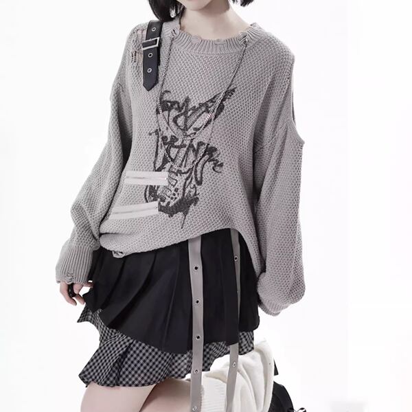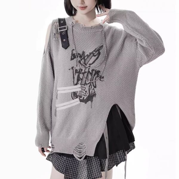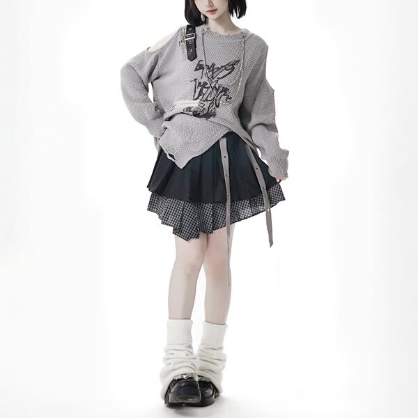オフショルチェーンアクセベルトジッパーダメージグレーニット(lli_6248)