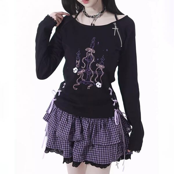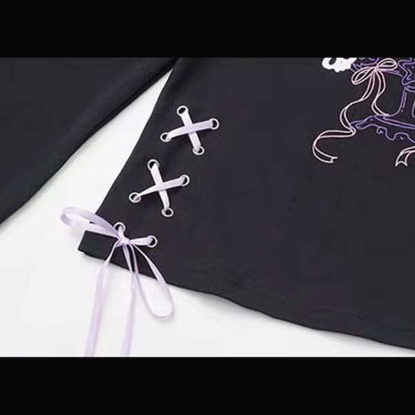 レースアップリボンキャンドルスカルキャットロングスリーブトップス(lli_6252)