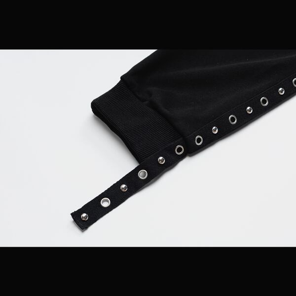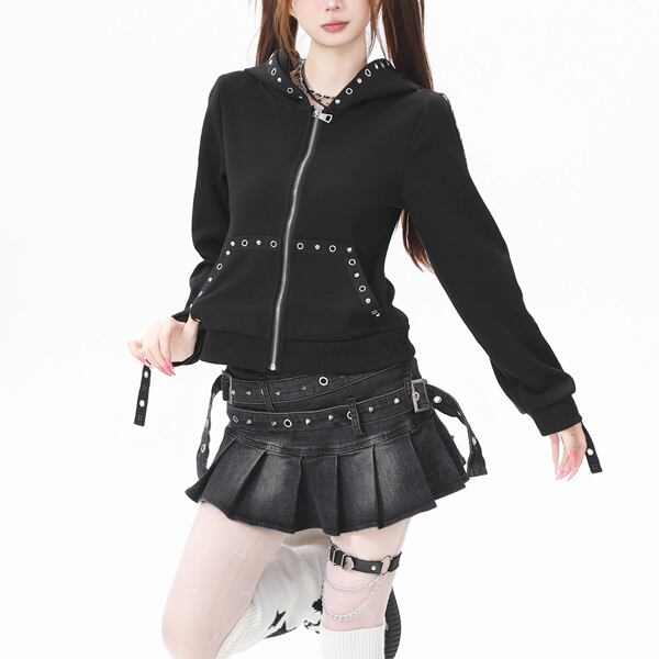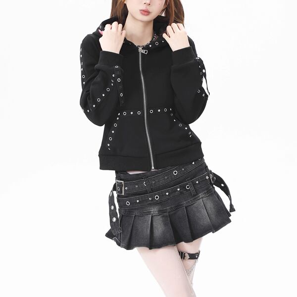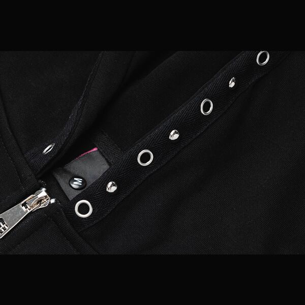 ハトメリベットジップアップブラックパンクパーカー(lli_6265)