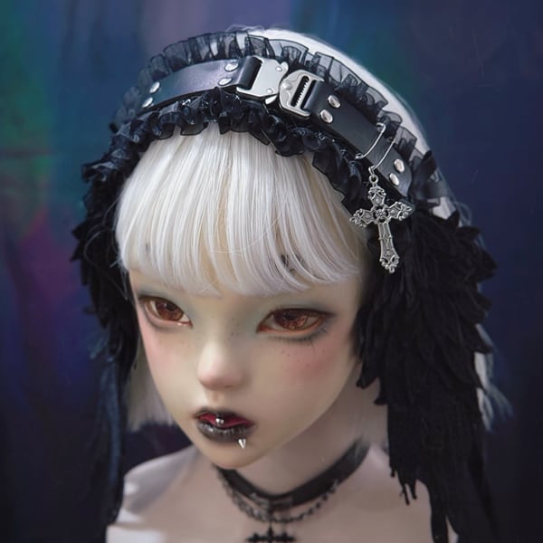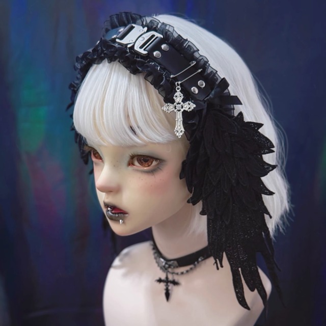 サブカルゴシック差し込みバックルフェザーフリルクロスカチューシャ(lli_6280)