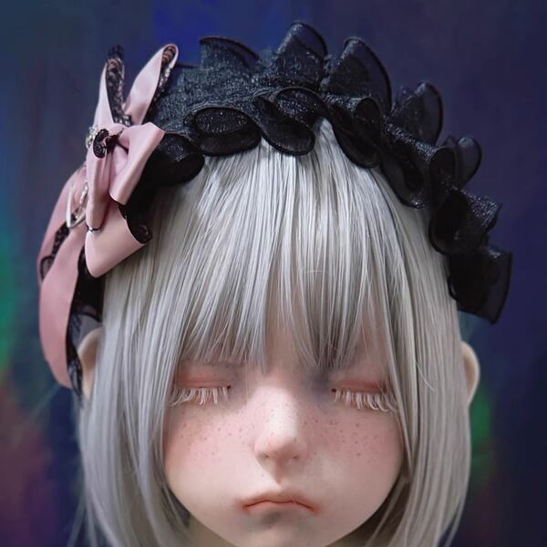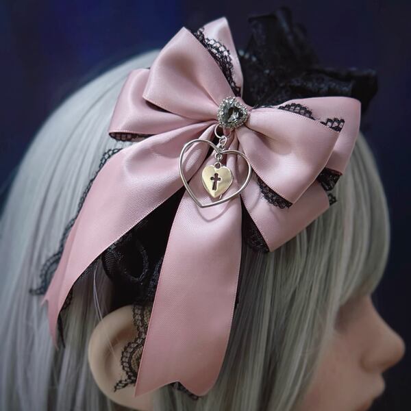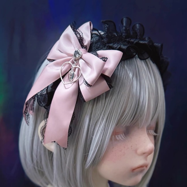 ピンクリボンメタルハートジェムブラックフリルカチューシャ(lli_6282)