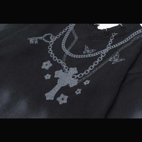 ダメージVネックロザリオチェーンキーグラフィックグランジニット(lli_6286)