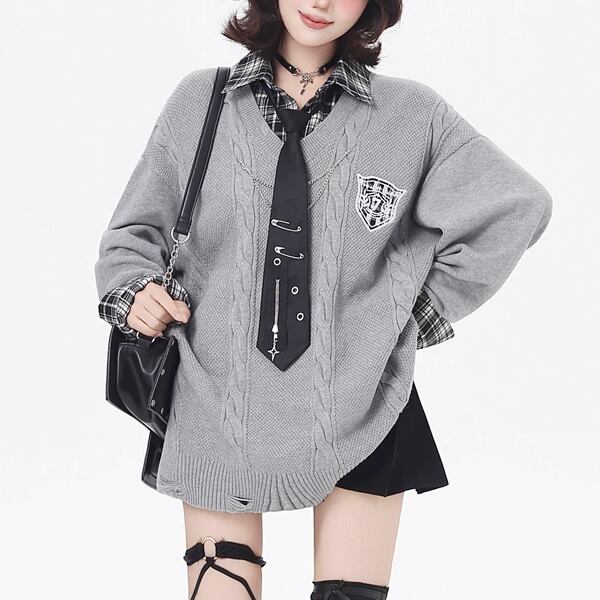 フェイクツーピースチェックシャツネクタイグレーニット(lli_6326)