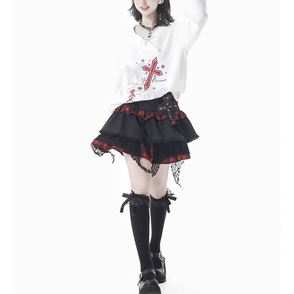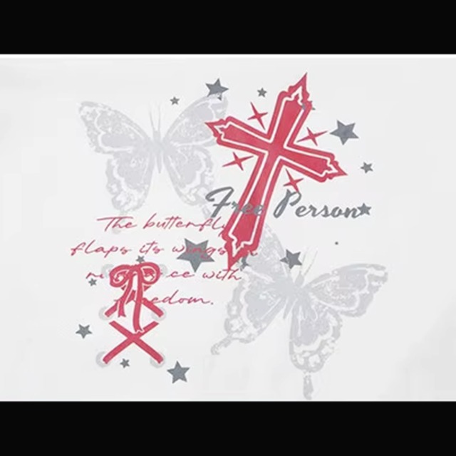 Vネックストラップスリーブボタンバタフライクロスグラフィックホワイトカットソー(lli_6334)