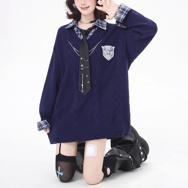 フェイクツーピースチェックシャツネクタイネイビーニット(lli_6337)