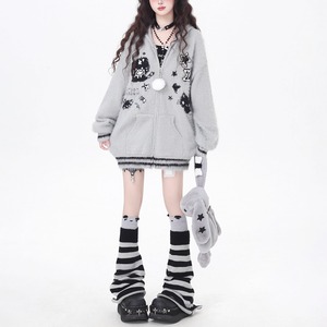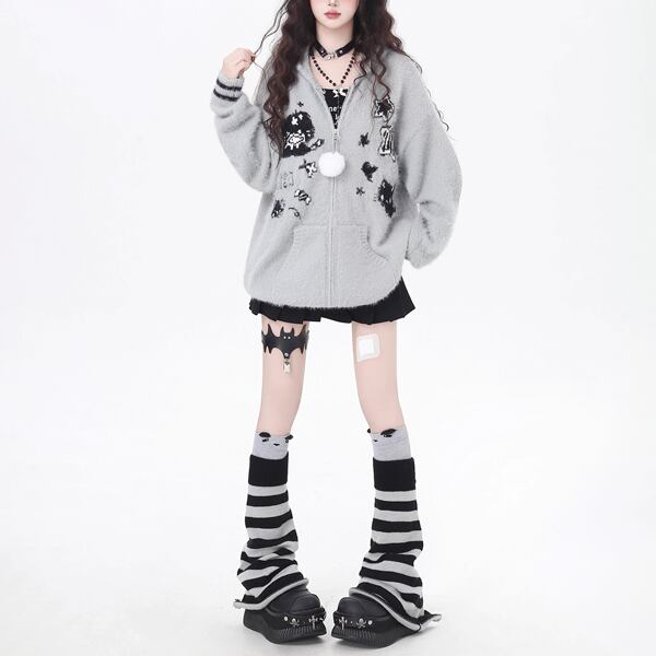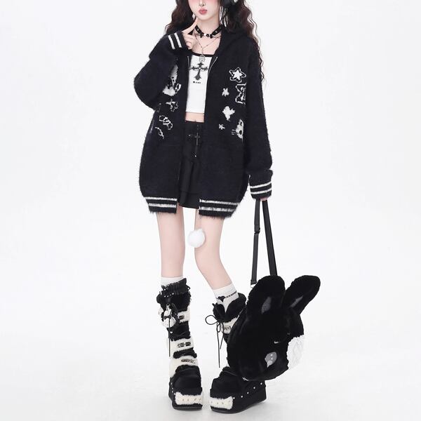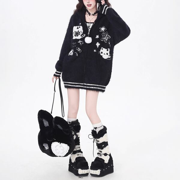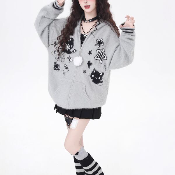 取り外しうさ耳フーディジップアップホワイトポンポンキャットニットパーカー(2カラーあり)(lli_6338)
