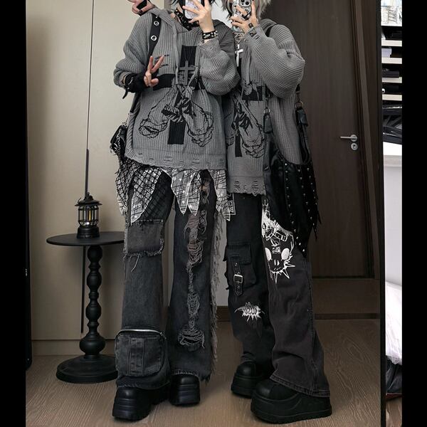 クロスプリントダメージフーディプルオーバー(lli_6356)