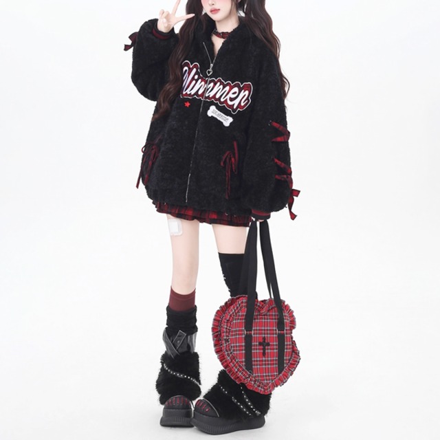 スリーブレースアップリボンジップアップフーディボアブラックジャケット(lli_6382)