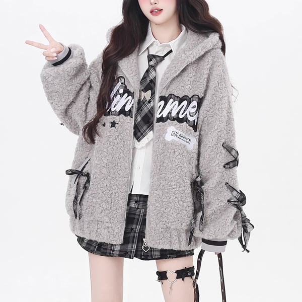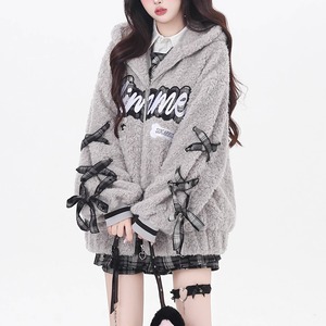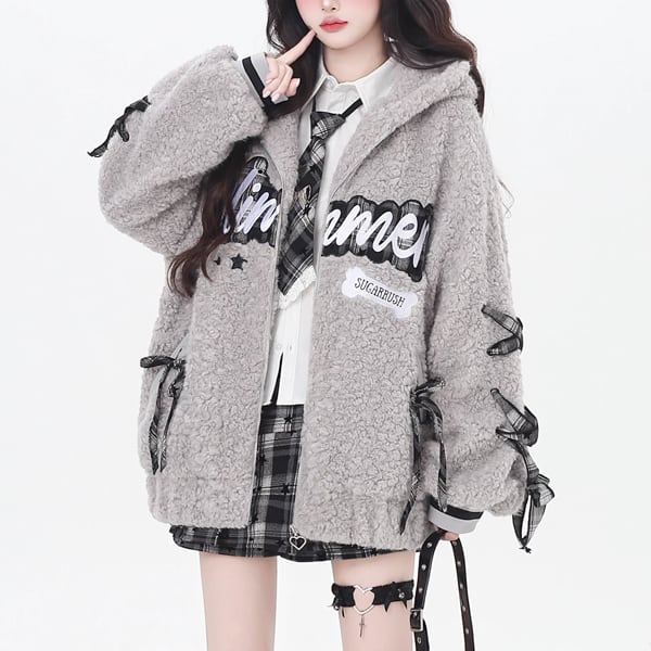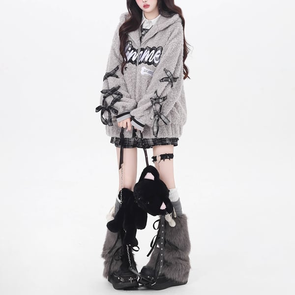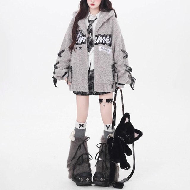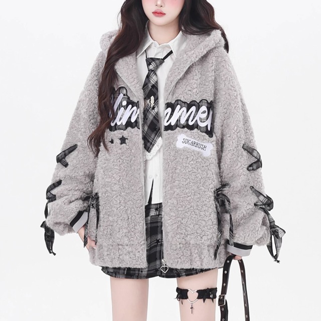 スリーブレースアップリボンジップアップフーディボアグレージャケット(lli_6399)
