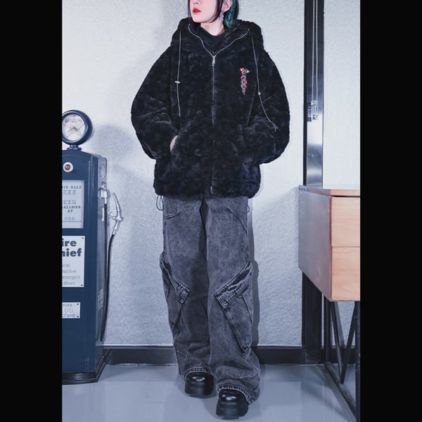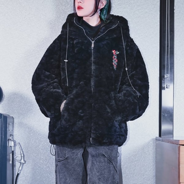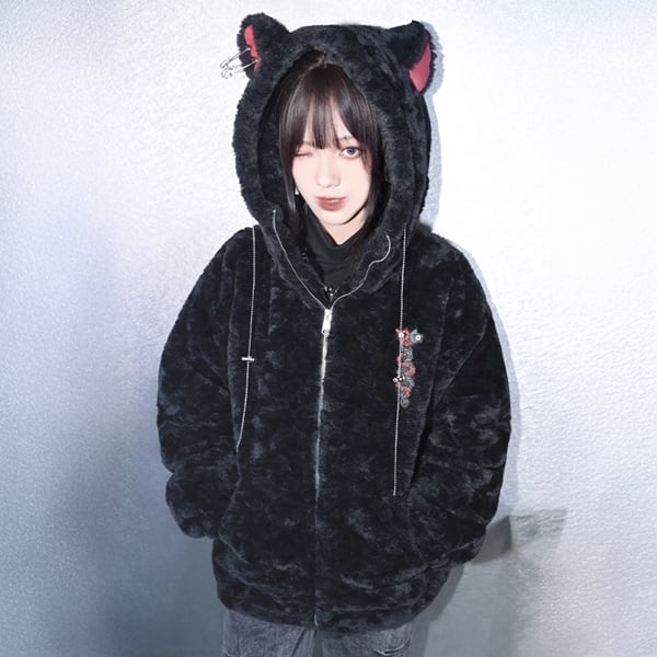 ジップアップボア猫フーディ刺繍ジャケット(lli_6408)