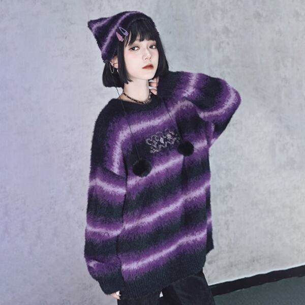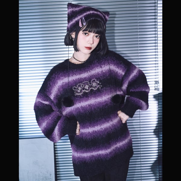 ブラックパープルボーダーボンボン猫キャップ(lli_6410)