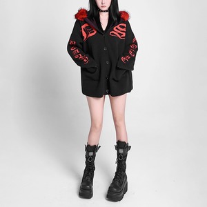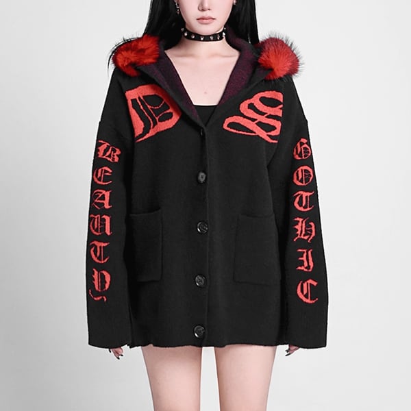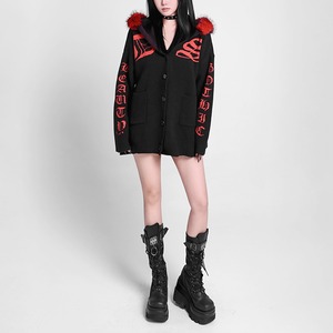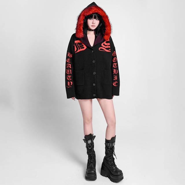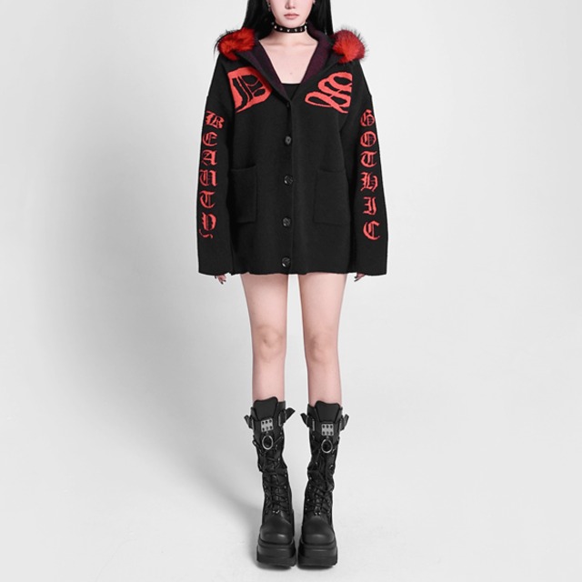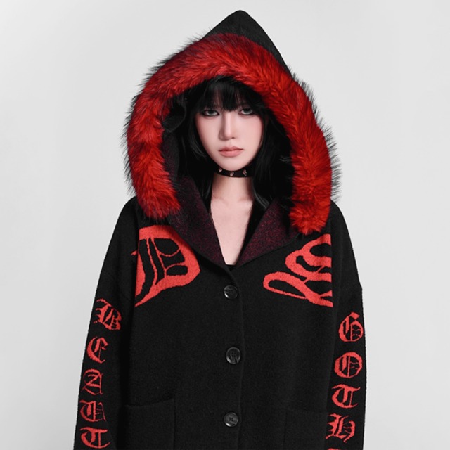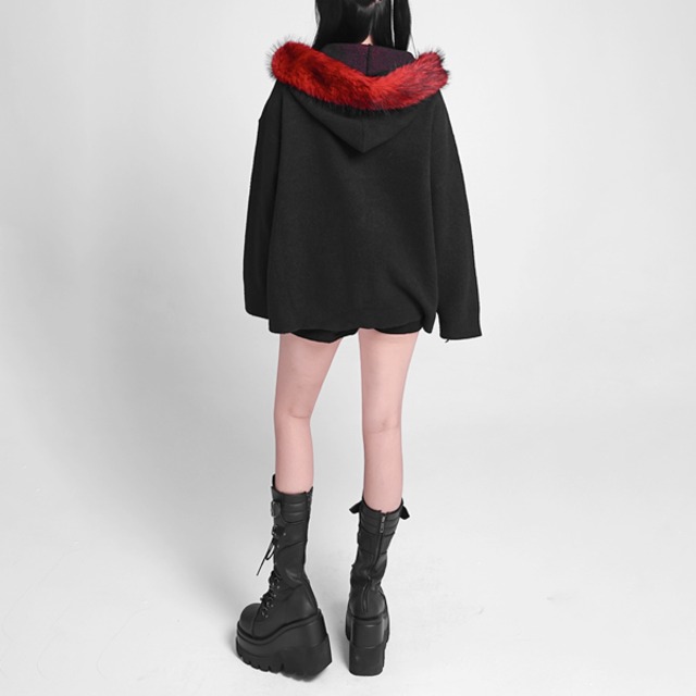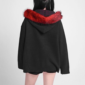 フェイクファーエッジフーディロゴボタンニットカーディガン(lli_6412)