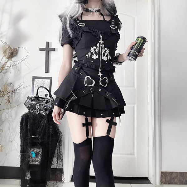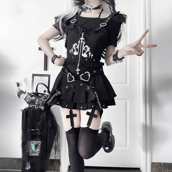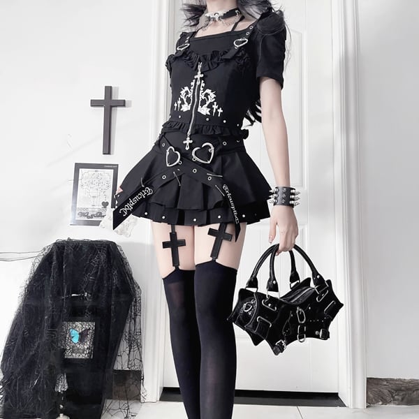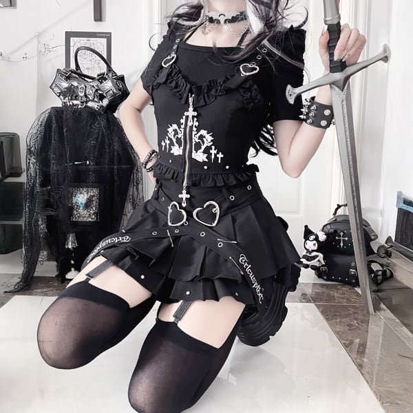 ハートバックルクロスベルトブラックスカート(lli_6429)