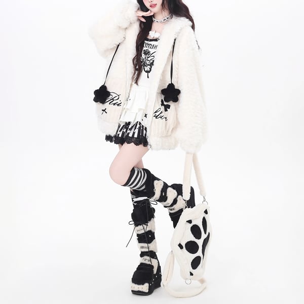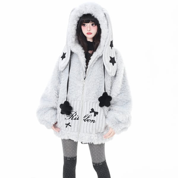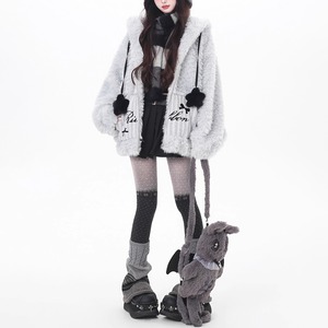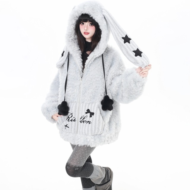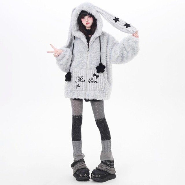 ラビットフーディポンポンコードジップアップモコモジャケット((2カラーあり)(lli_6448)