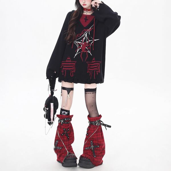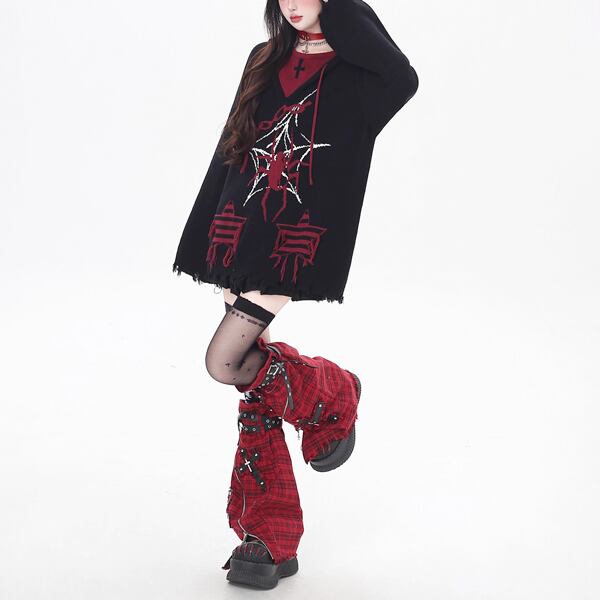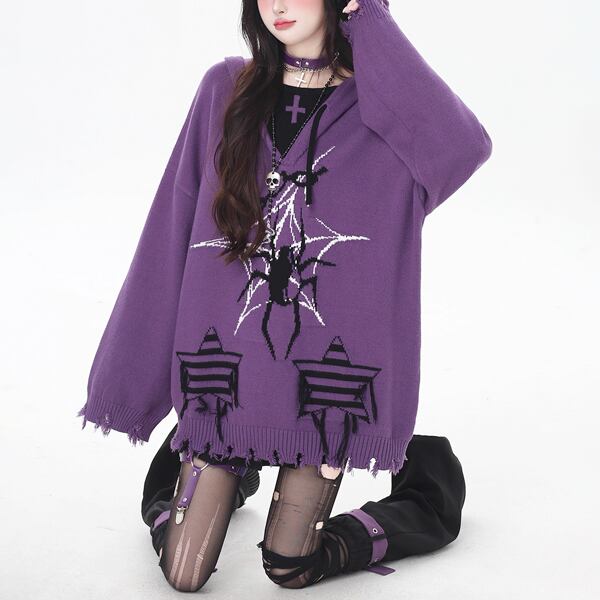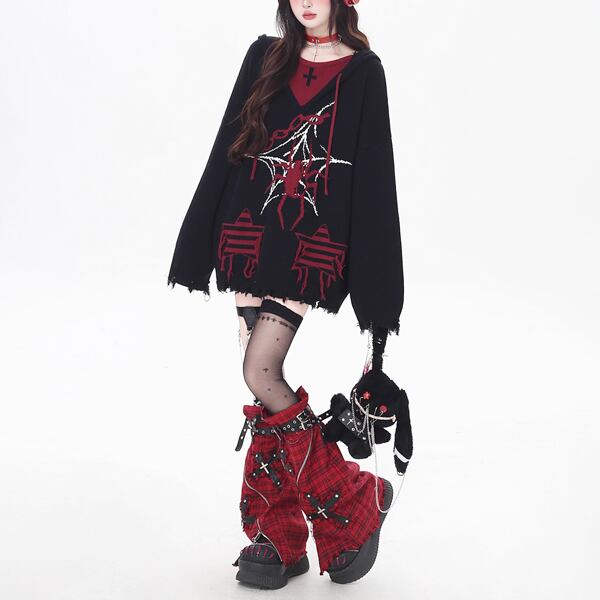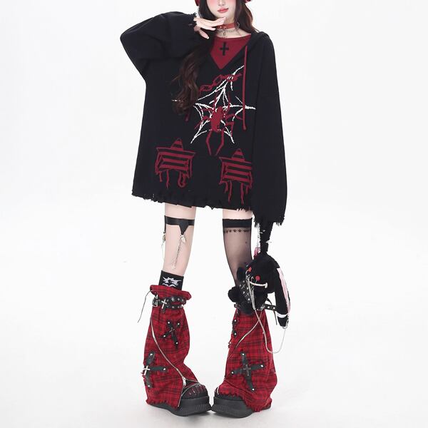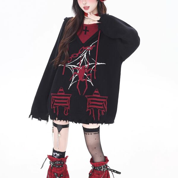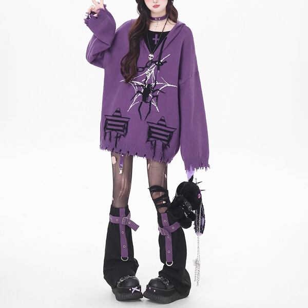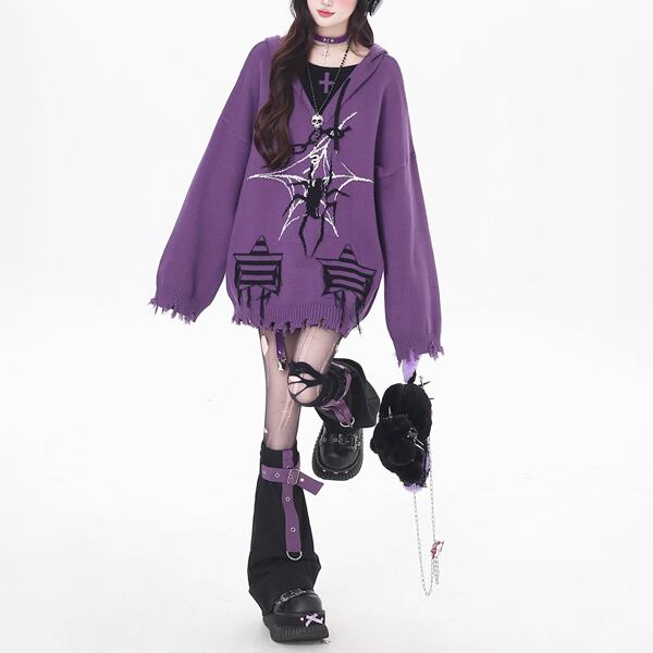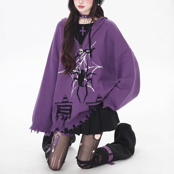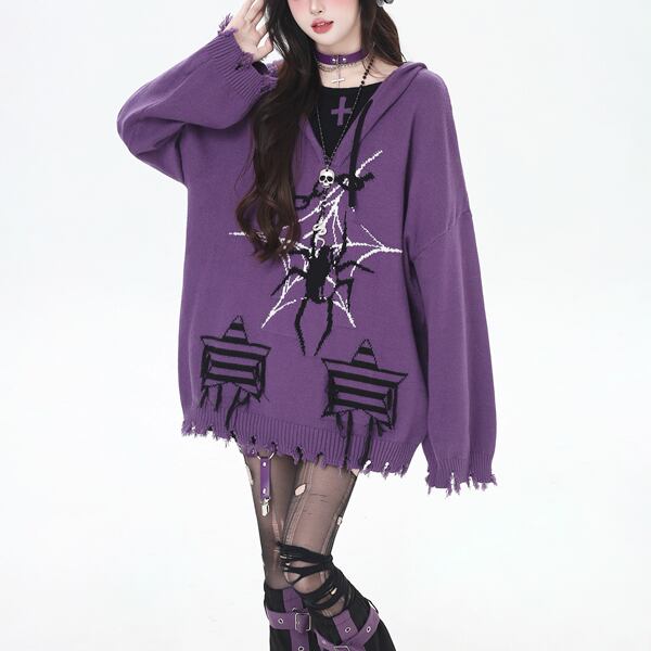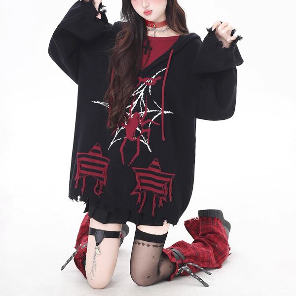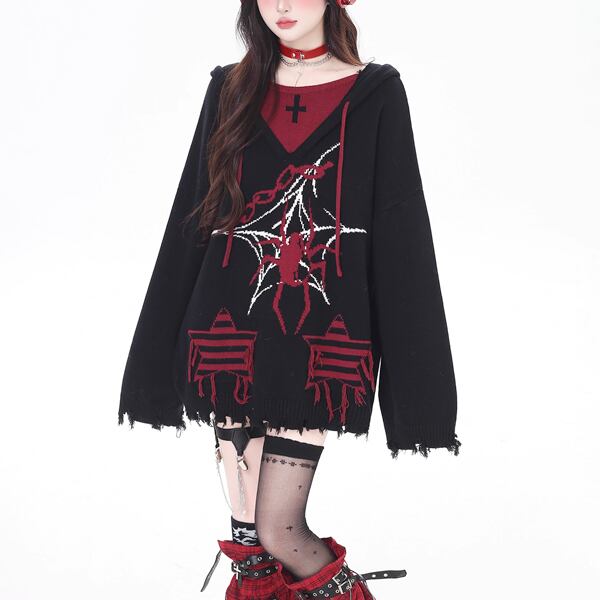 フェイクツーピースダメージスパイダーフーディニット(2カラーあり)(lli_6456)