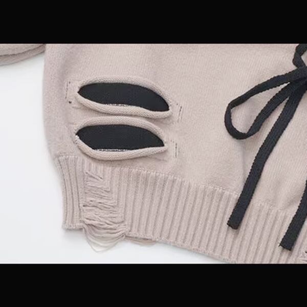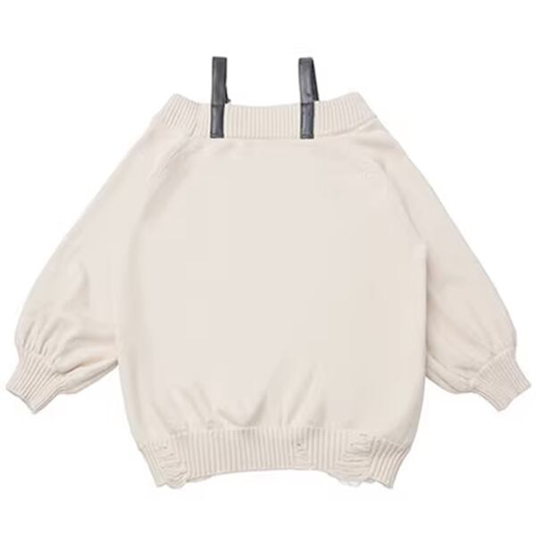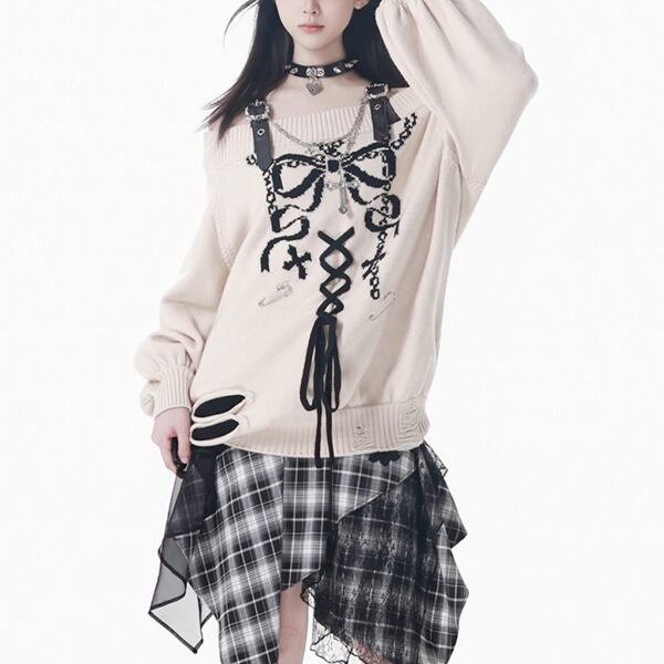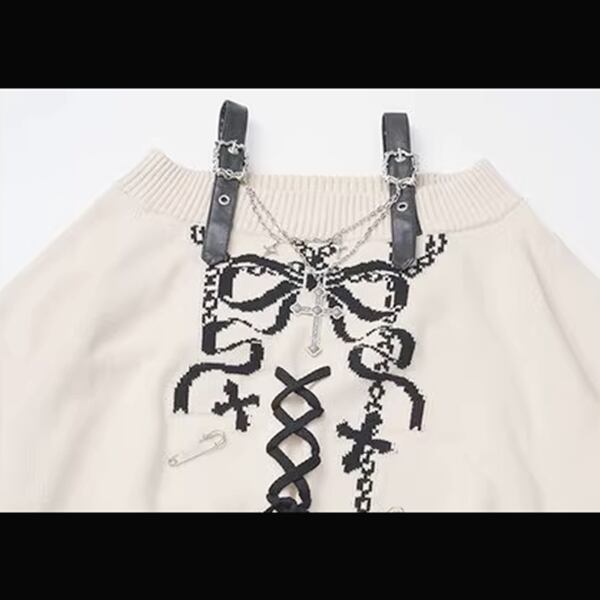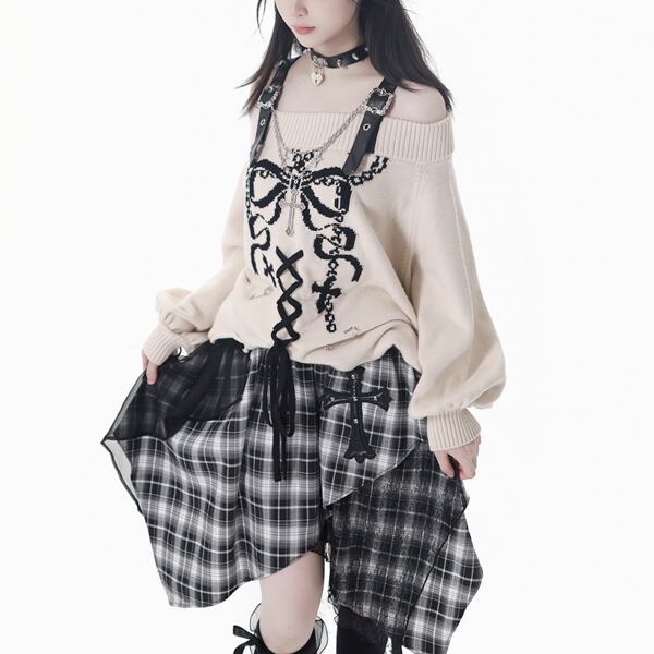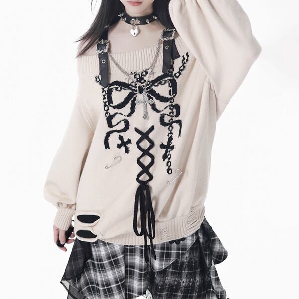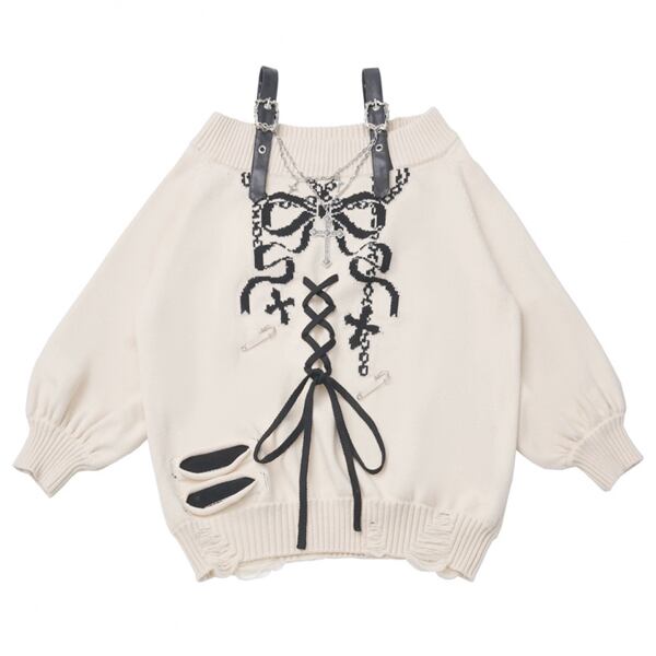 ベージュオフショルロザリオチェーンダメージレースアップリボンボリュームスリーブニット(lli_6462)