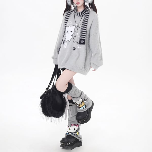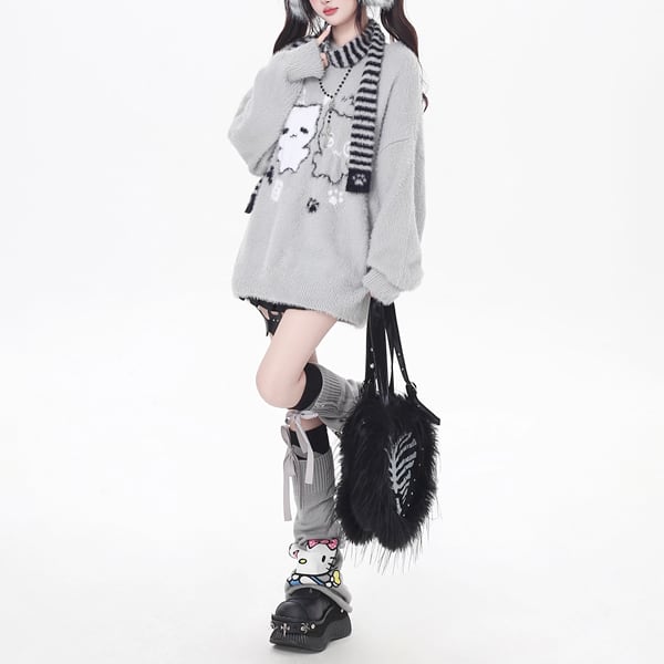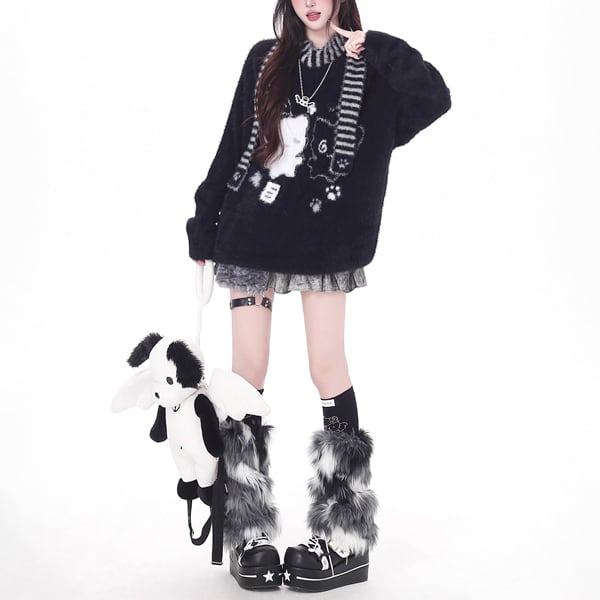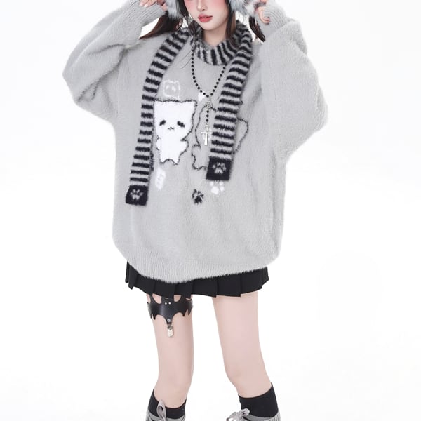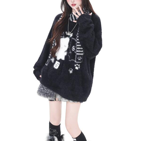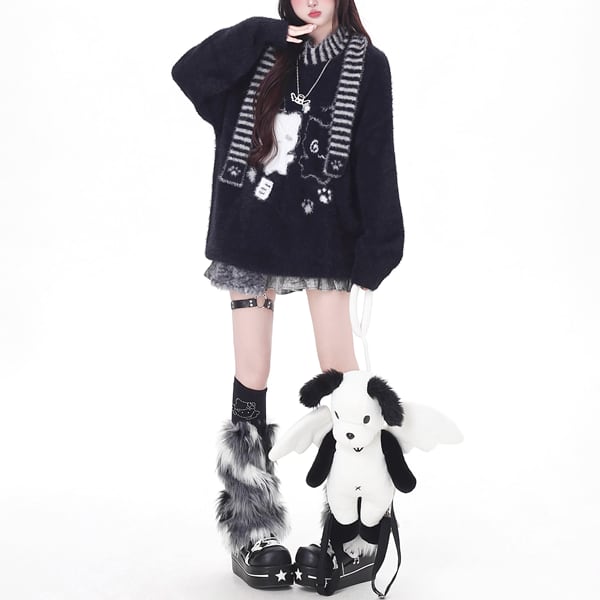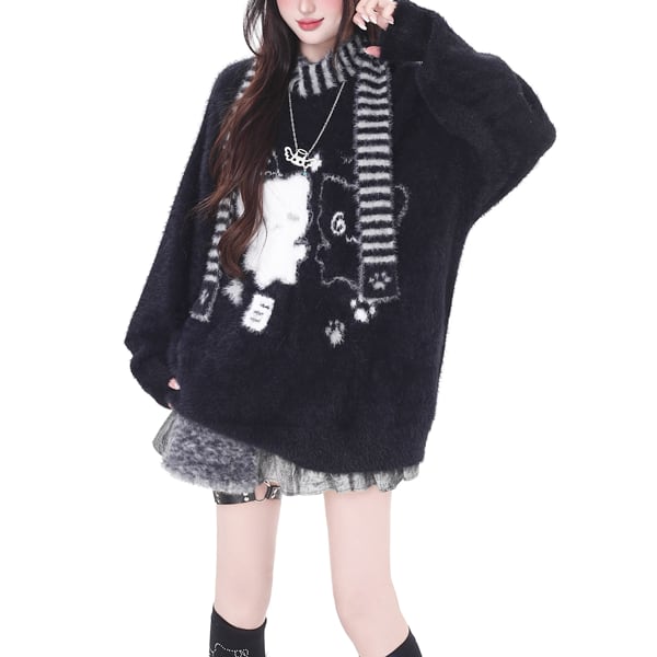 ボーダーストール付きニャンコグラフィックニット(2カラーあり)(lli_6495)
