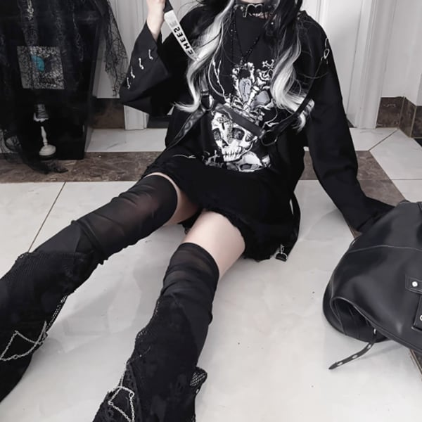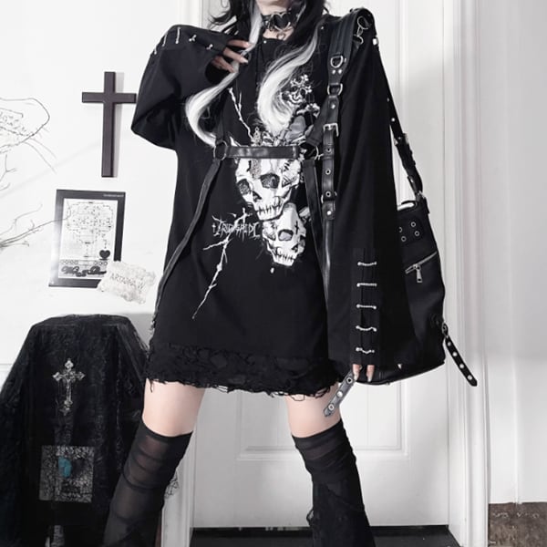 チェーンスリーブスカルキャットハーネスストラップブブラックグレーロングスリーブカットソー(lli_6503)