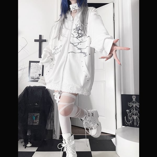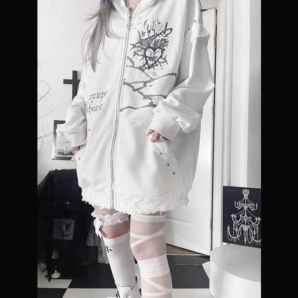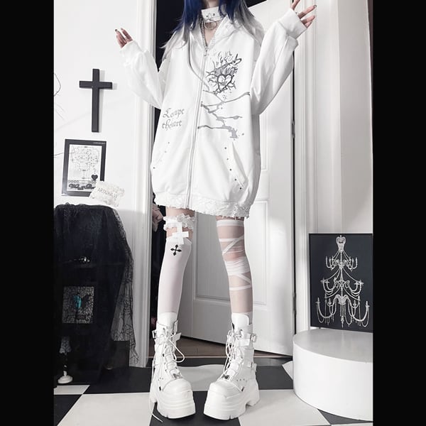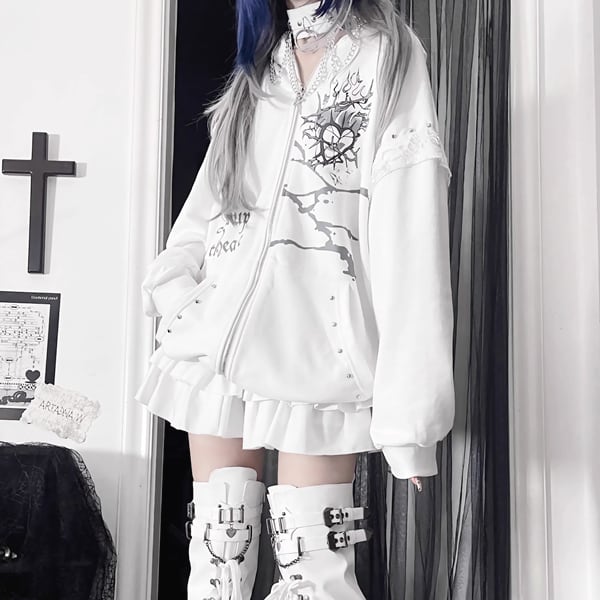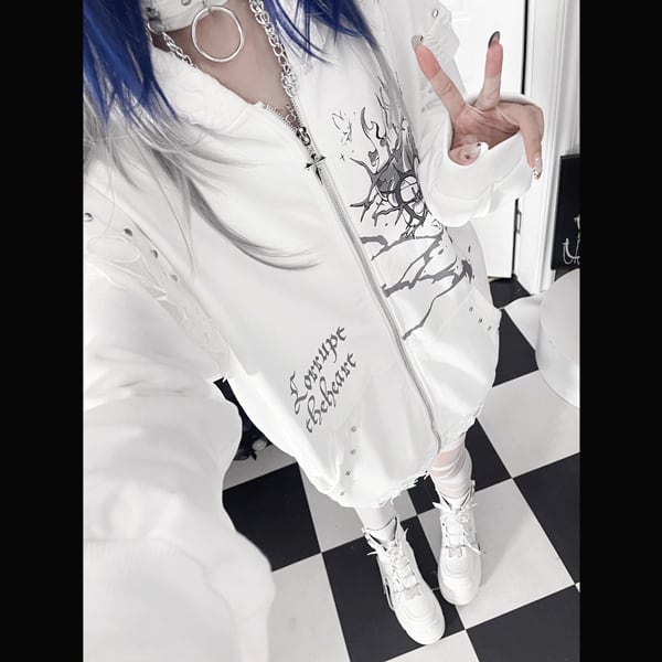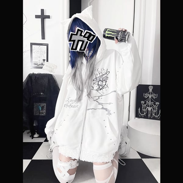 ホワイトグレーグラフィック猫耳フーディジップアップパンクグラフィックハートジップアップパーカー(lli_6505)