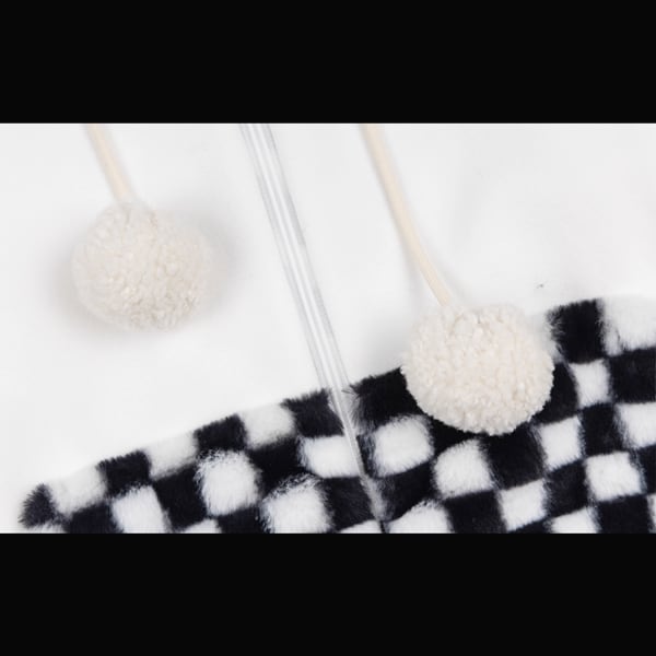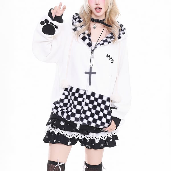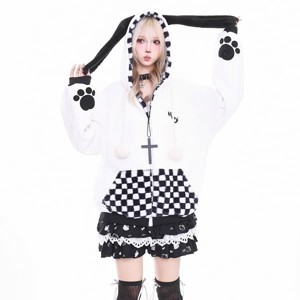 ホワイトブラックチェック切り替えウサ耳フーディジップアップパーカー(lli_6514)