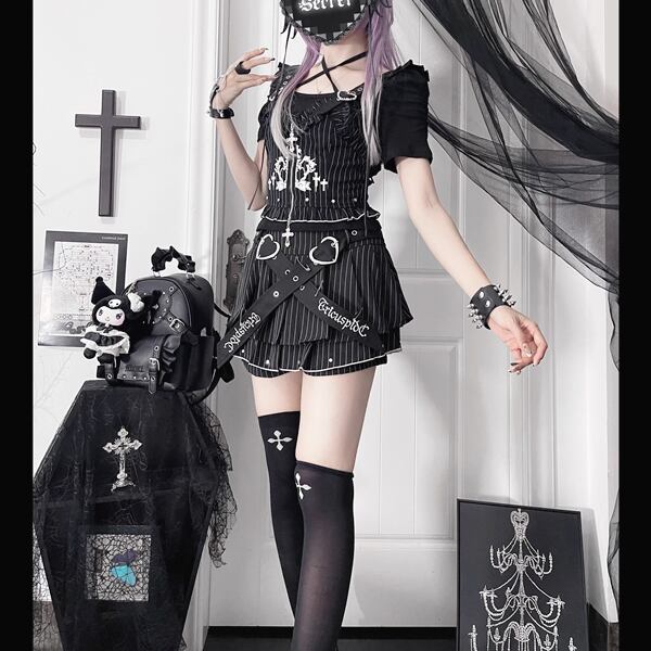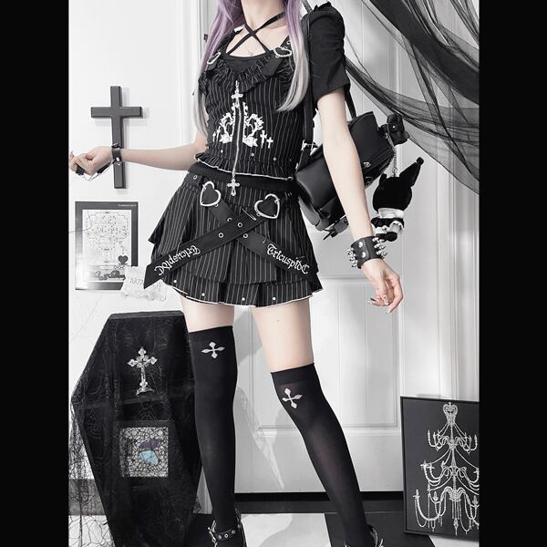 ハートバックルクロスベルトストライプスカート(lli_6536)