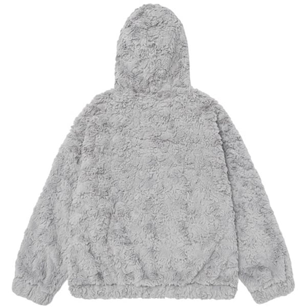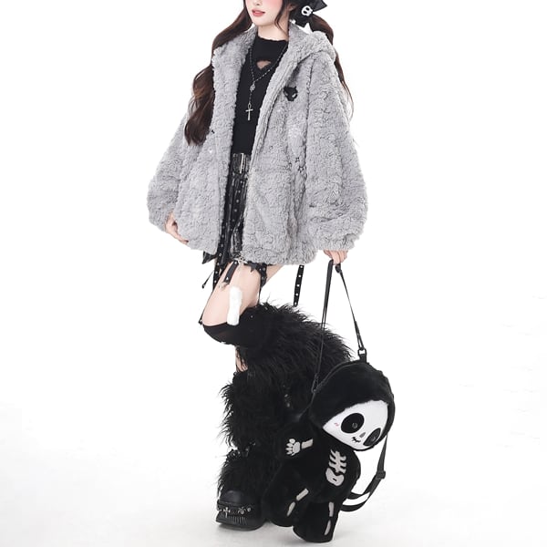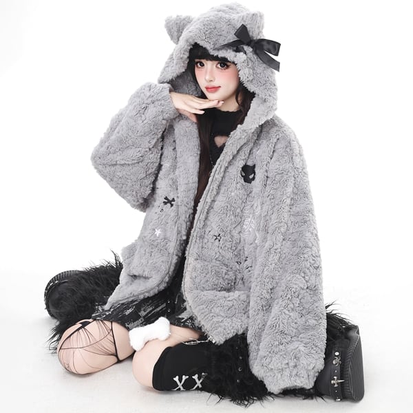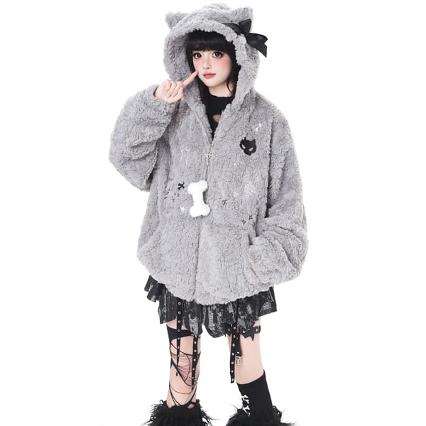 猫耳フーディリボンホワイトボーンジッパーもこもこボアグレージャケット(lli_6538)