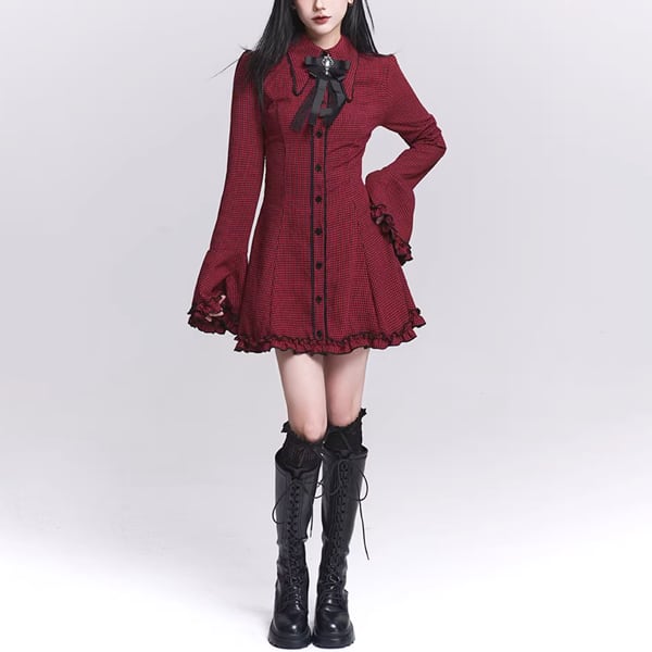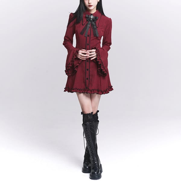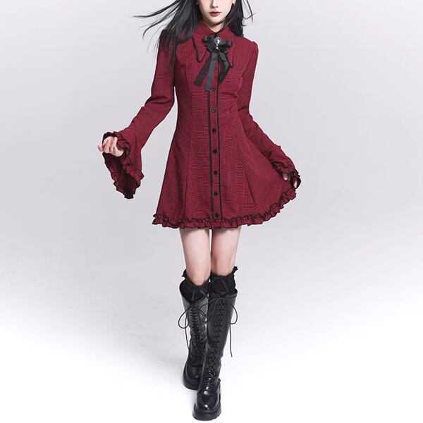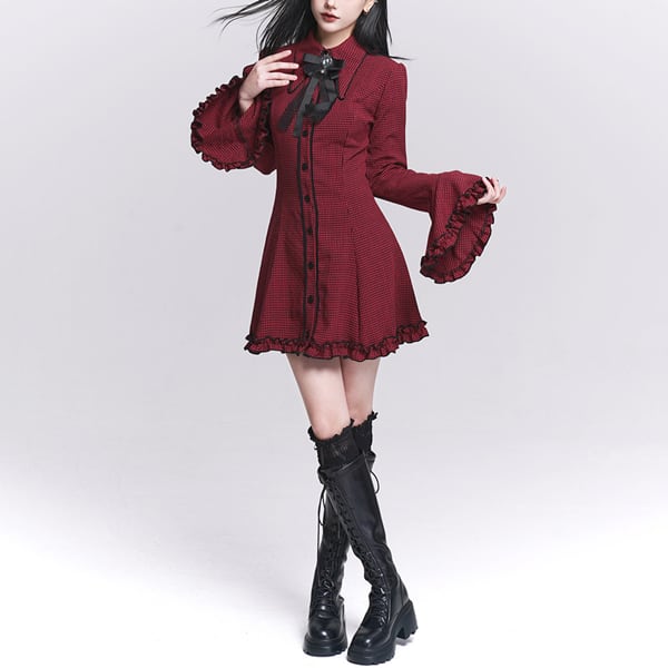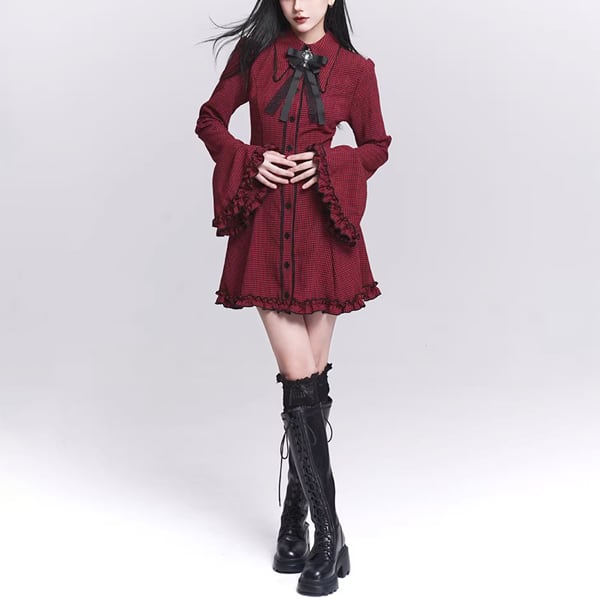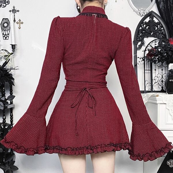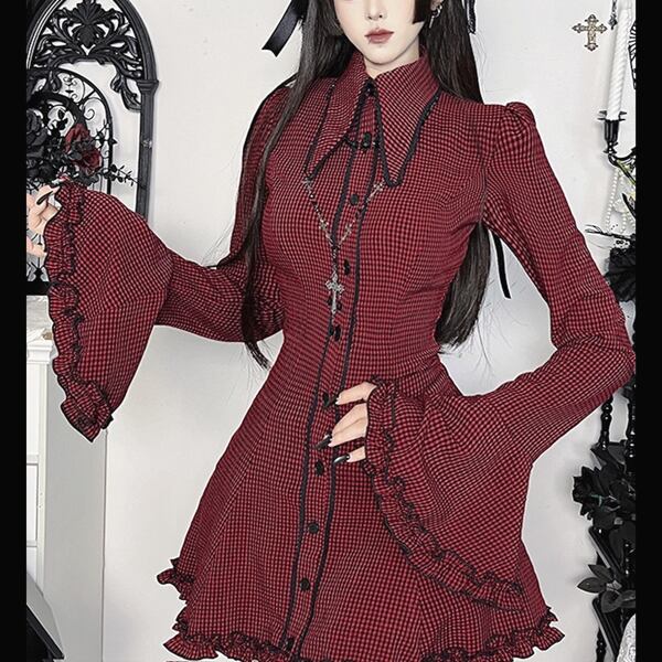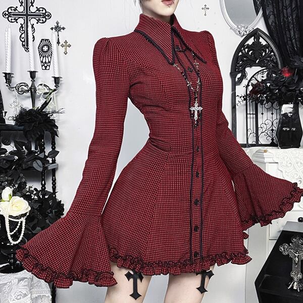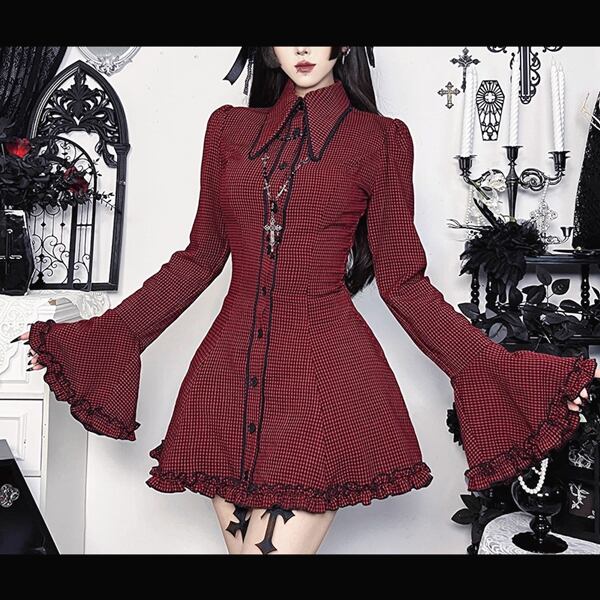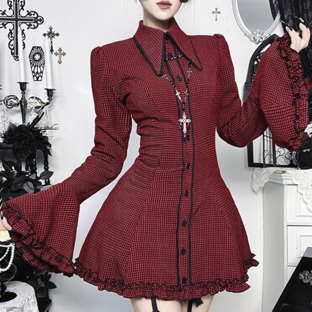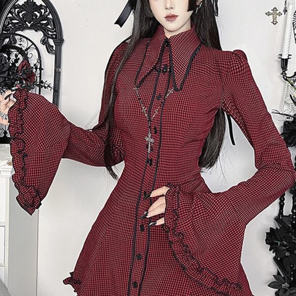 ダークゴシックチェックフレアスリーブワンピース(lli_6567)