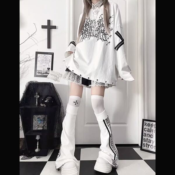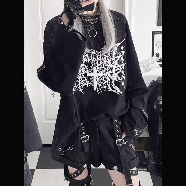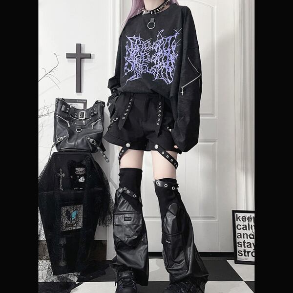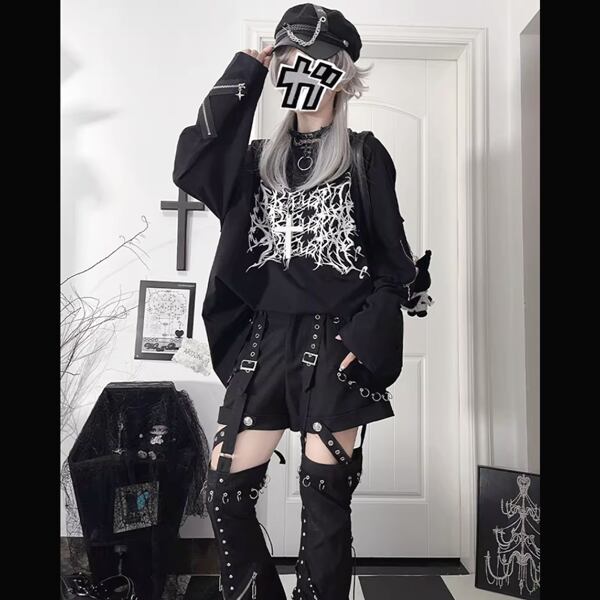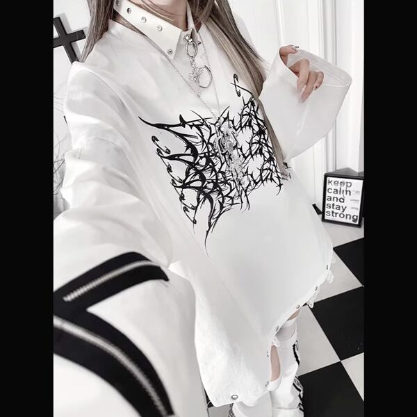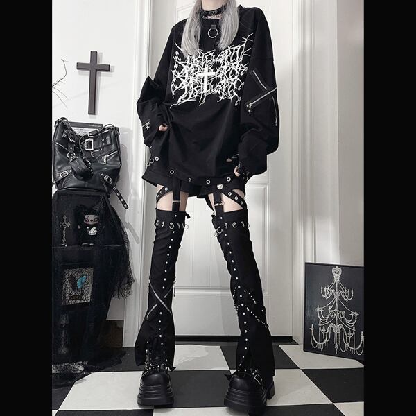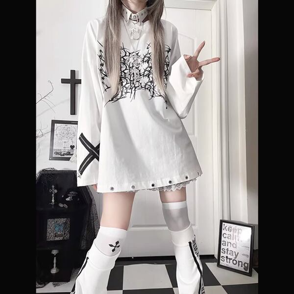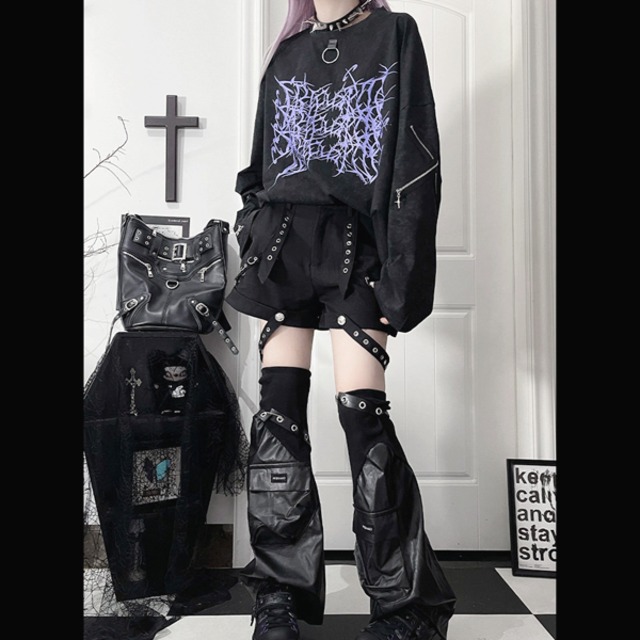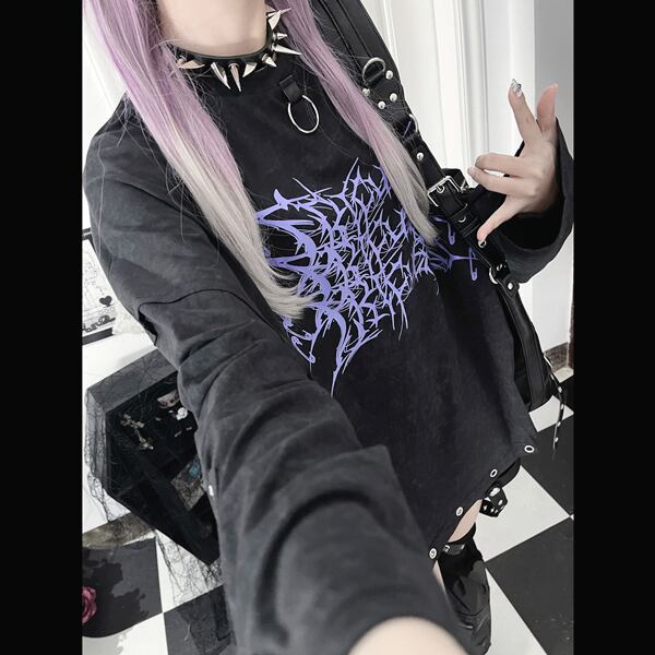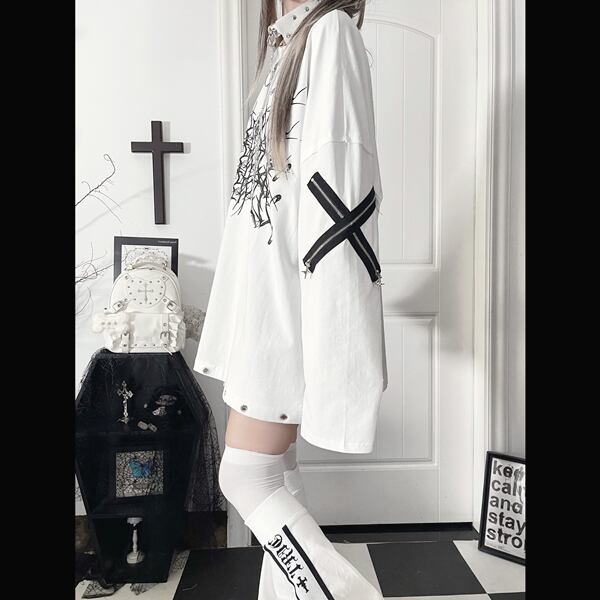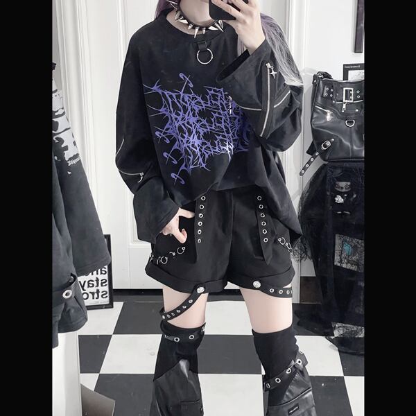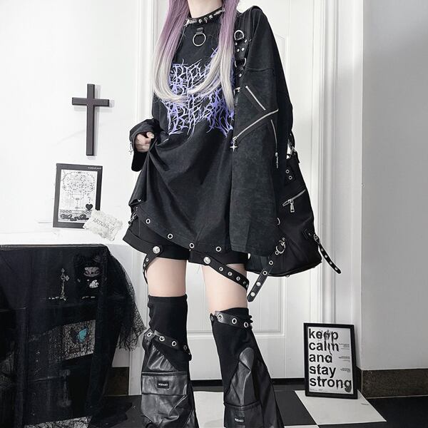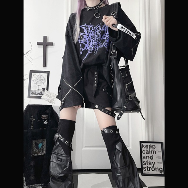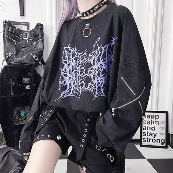 アングラプリントスリーブジッパー×リング ロングTシャツ(3カラーあり)(lli_6590)