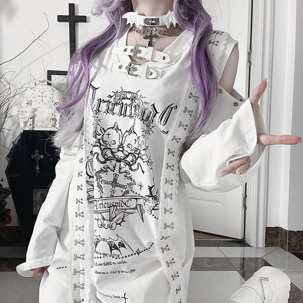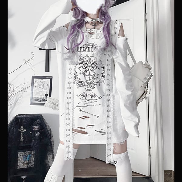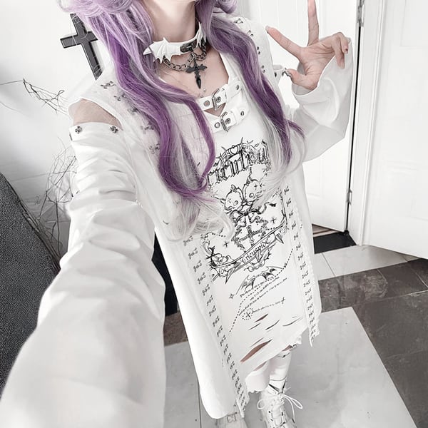 ツインバックルVネックダメージゴシックホワイトロングT(lli_6597)