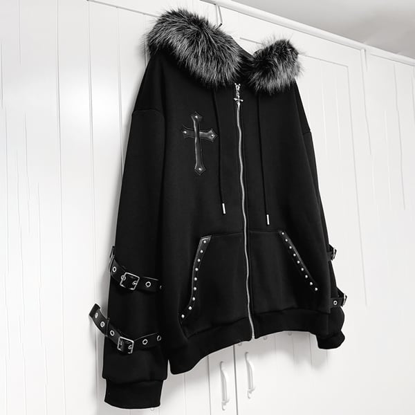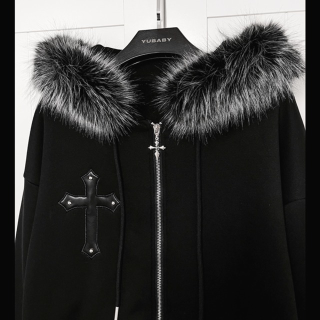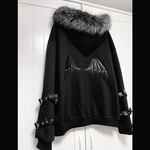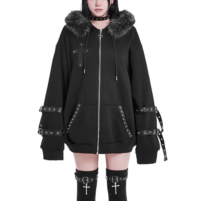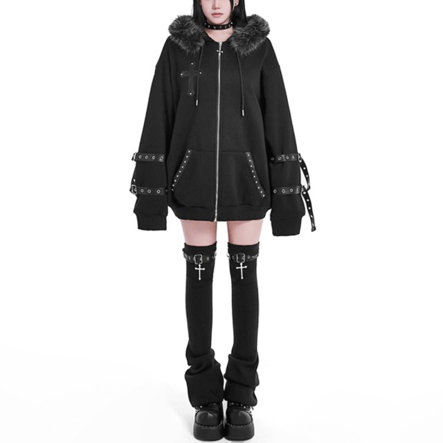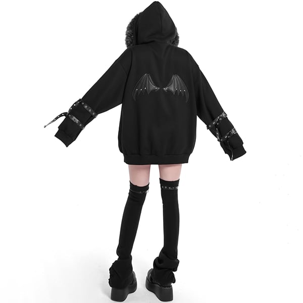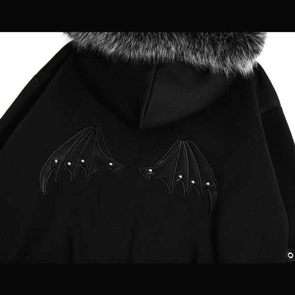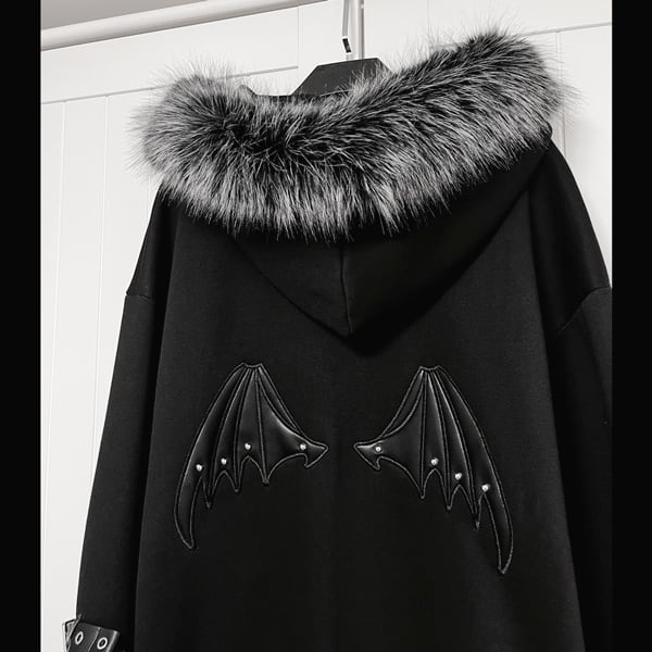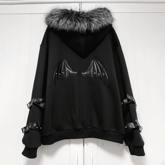 ウィングデーモン 裏起毛ファーフードゴシックブラックフーディ(lli_6600)
